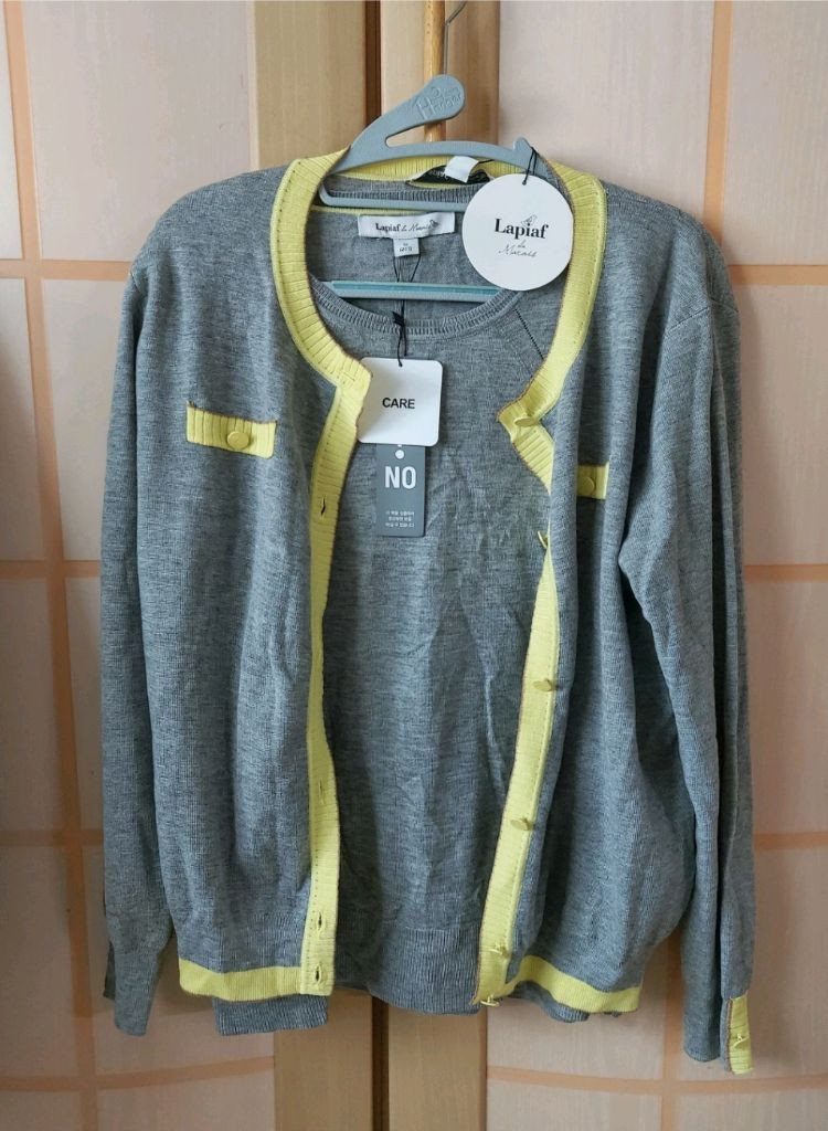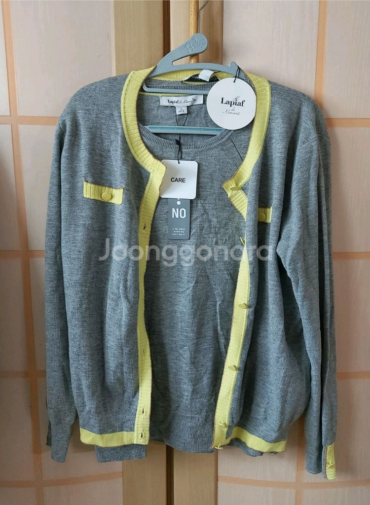 택 달린 완전 새 상품입니다. Laplaf de Macaroon 가디건 세트이고, 가디건과 안에 입는 반팔 상의 세트 상품이에요. 사이즈는 95인데 77사이즈로 나왔어요. 가디건은 폴리에스터 52%, 아크릴 23%, 나일론 20%, 모 5% 혼방이고요. 얇은 재질이라 간절기에 입기 좋을 것 같아요! 지금 입기에 너무 좋은 상품 입니다. (구입 후 반품, 환불 불가)