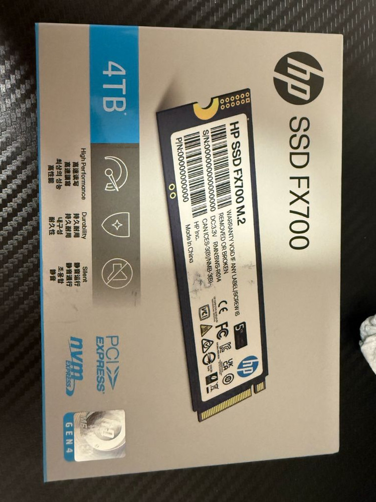 HP SSD FX700 M.2 4TB 제품이에요 한달정도 사용했어요 최대읽기속도 7200MB/S 고성능, 내구성, 저소음 특징을 가진 SSD입니다 PCIe 4.0 NVMe 인터페이스를 지원하며 빠른 속도를 자랑해요 문서 작업, 영상 편집 등 고사양 작업에 적합한 제품입니다