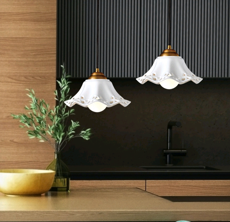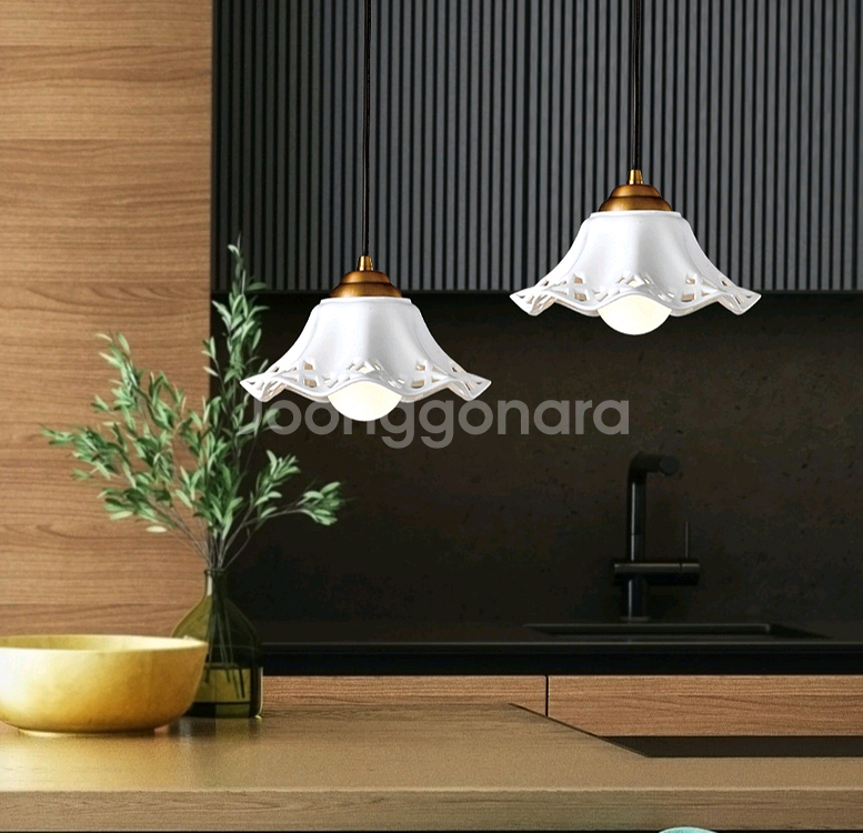 흰색 도자기 꽃주름 갓에 황동 브라켓이라 깔끔하면서 분위기 있습니다. 2구 조명이고 줄 길이 조절해서 조명 높이를 다르게해서 색다른 분위기로 연출 할 수 있습니다. 벽, 천정 등 식탁 조명이나 다양한 공간에 포인트 조명으로 설치해서 쓰실수 있습니다 첫번째 사진은 유사한 조명 이미지 사진입니다 갓 지름 약 21센치 청주는 직거래도 가능합니다