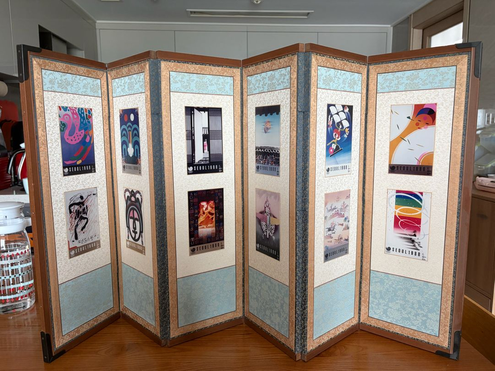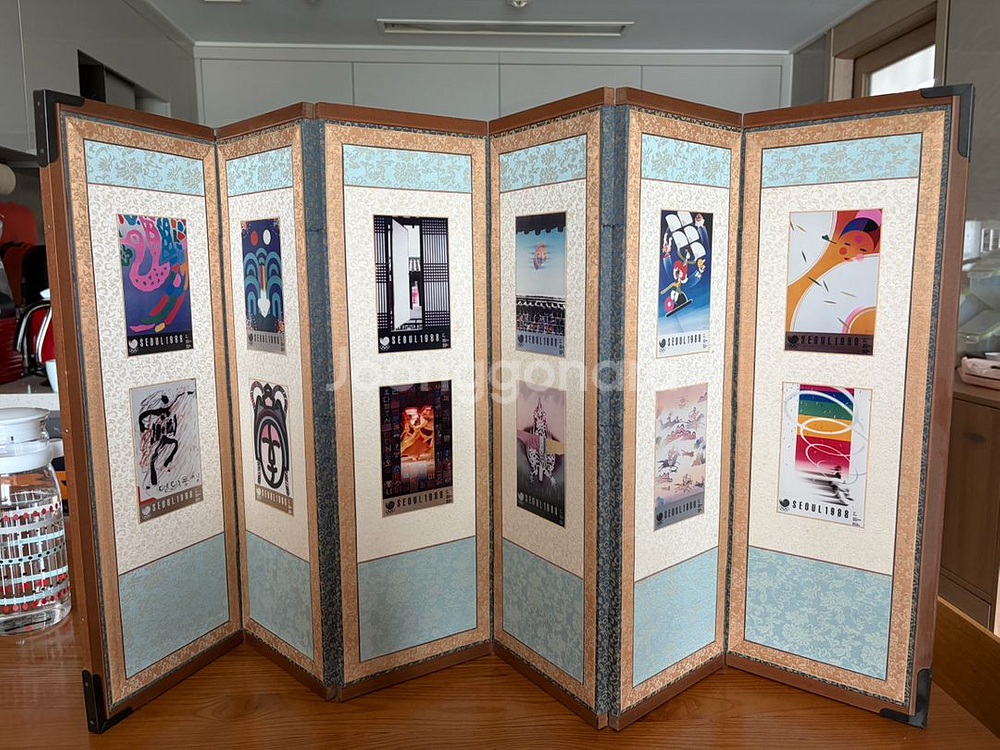 아버지가 88올림픽 기념품 제작업체에 재직시 제작했던 포스터 실물병풍(2000개 한정제작했었다고 합니다.)의 미니어처 버젼입니다. 실물병풍 제작전 미니어처 버젼으로 샘플제작했던 것이라고 합니다. 국내 1개만 있는 제품입니다.