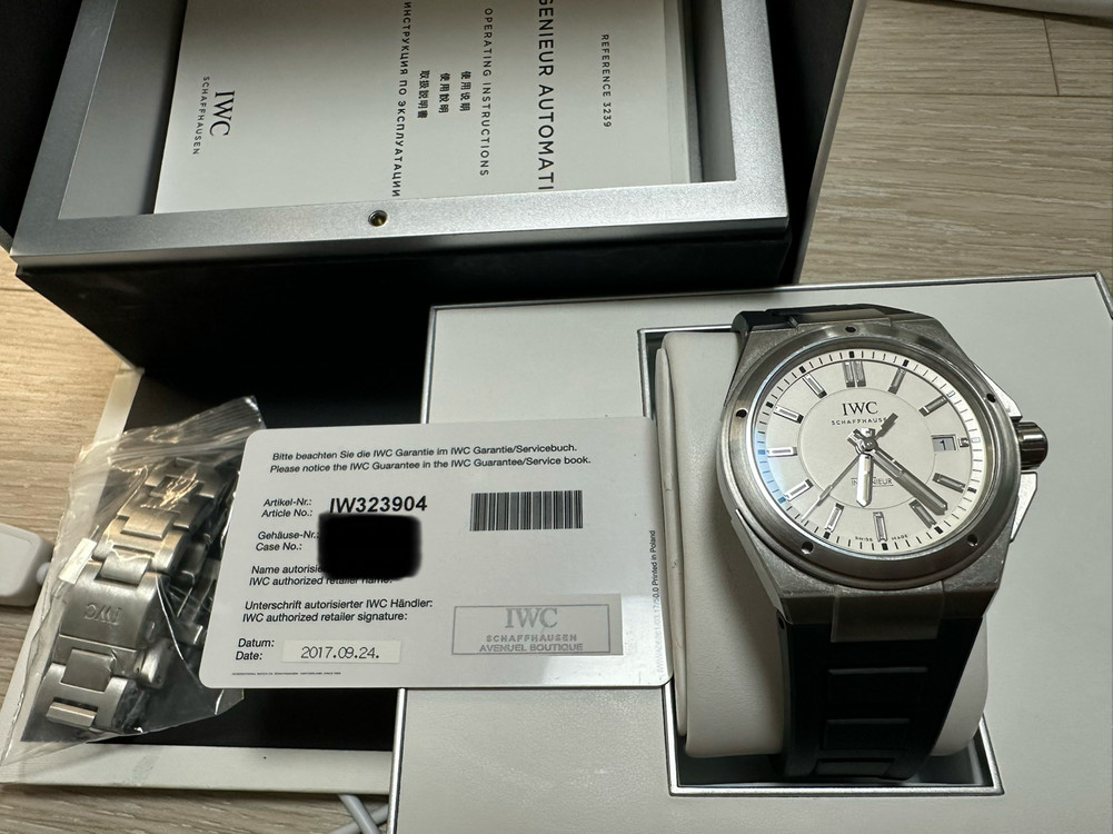 ★ 시계거래소 거래 양식 ★ (모델번호, 리테일가, 가격 미기재, 오기재시 삭제) 0. 모델번호 : iwc3239 1. 모델명 : 인제니어 구구형 2. 스템핑일자 : 2017-09-24 (년-월) 3. 리테일가 : OOOO (해당연도 백화점가) 4. 판매가격 : 630만 (ex. 12000)(만원단위 최종가격) 5. 구성품 : 풀구성 , 메탈밴드 러버밴드 보증서 박스 전부 보유 중입니다 6. 시계상태 : 9 7. 수리여부 : 작년 사설 오버홀 1회(종로) 8. 시계거래소 앱채팅(링크) : 9. 연락처 : 010-8989-3073 10. 하고 싶으신 말 : 전화 또는 시계거래소 앱 채팅으로 대화주세요 지역은 목포, 광주광역시 입니다 이동 가능하냐는 연락 오는데 제가 이동은 힘듭니다ㅠㅠ 믿고 택배거래 해주시는 분께는 10만원 더 빼드립니다. 저보다 거래내역 많으신분은 원하시면 안전거래 해드립니다 (수수료 구매자 부담) 프로포즈 예산 부족으로… 정말 아끼는 시계 올립니다ㅠㅠ
