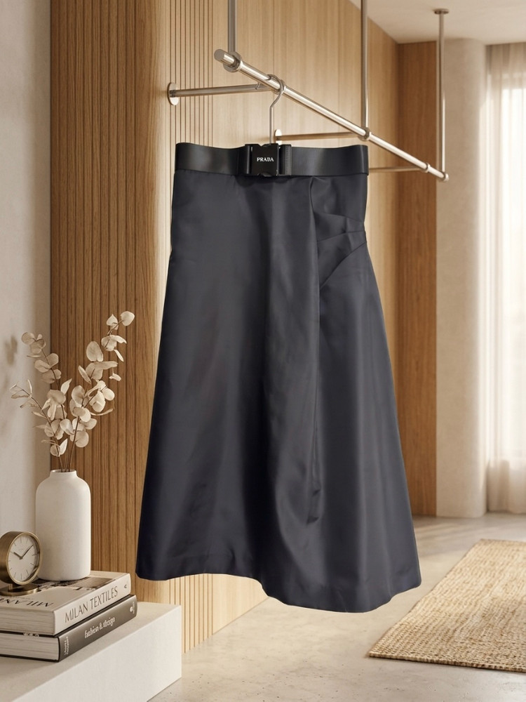 프라다의 시그니처 리나일론 소재로 제작된 벨티드 스커트예요 - 사이즈 : L (28~30) - 허리 28~30cm / 총장 : 77cm / 엉덩이 : 54cm - 허리의 독특한 버클 디자인이 포인트이며 - 고급스러운 블랙 색상으로 어떤 상의와도 잘 어울려요 - 사진에서 보이는 것처럼 깔끔하게 관리되어 있어요 - 세련되고 모던한 스타일을 연출하고 싶으신 분들께 추천드려요