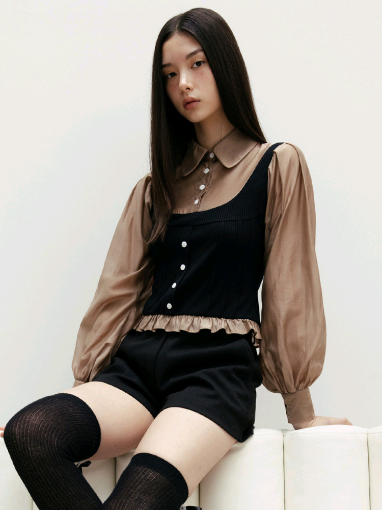 M 시착만 해본 새옷 매력적인 브라운 컬러의 시스루 블라우스에요 블랙 니트 조끼와 함께 레이어드되어 있어 더욱 멋스러워요 소재 혼용률은 폴리에스터 84%, 폴리우레탄 16%로 부드럽고 편안하게 착용 가능해요 특별한 날, 데이트룩으로 연출하기 좋은 블라우스랍니다 채팅주세요