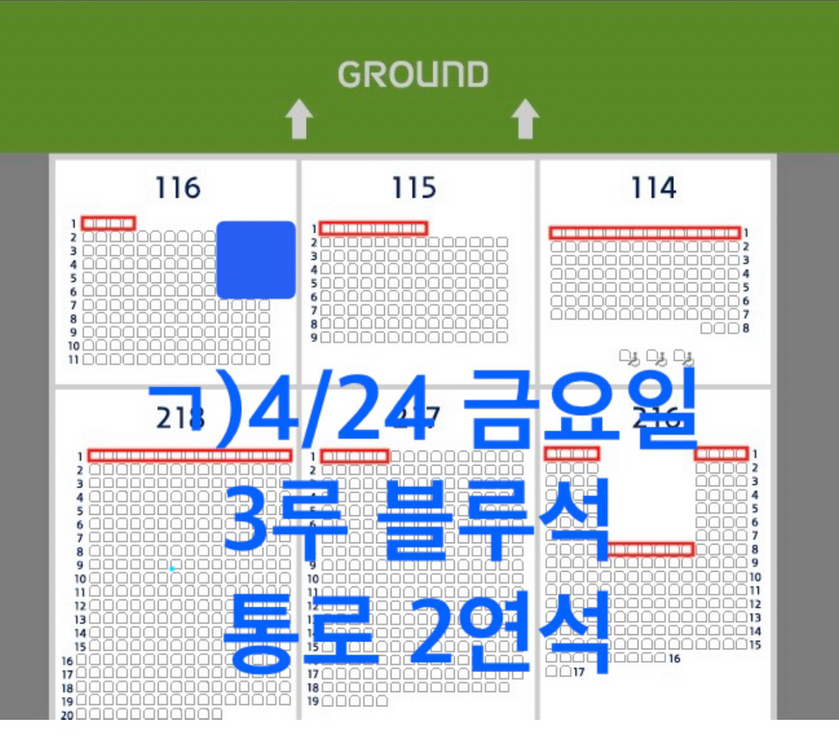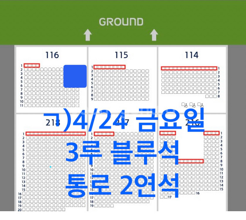 4월24일(금) 잠실 두산vs엘지 3루 블루석 통로 2연석 4/24 금요일 잠실 두산베어스 VS LG트윈스 ㄱ) 4/24(금) 3루 블루석 116블럭 통로2연석 장당 4만 ★ 모바일티켓으로 전송해드립니다. ★ 우취 또는 KBO 공식 경기취소시에만 환불 해드리며, 그 외에는 환불되지 않습니다.