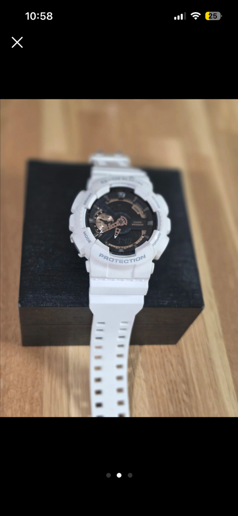카시오 지샥 GA-110RG 화이트 시계 내구성이 좋은 G-SHOCK 모델이고 화이트 색상이에요 20BAR 방수 기능이 있고 충격 흡수 구조로 되어 있어요 모델명은 GA-110이고 뒷면에 CASIO GA-110RG-7A라고 적혀 있어요 아주편하게착용할수있는 상품입니다 많은문의주세요 쿨거시 택배비 빼드릴게요