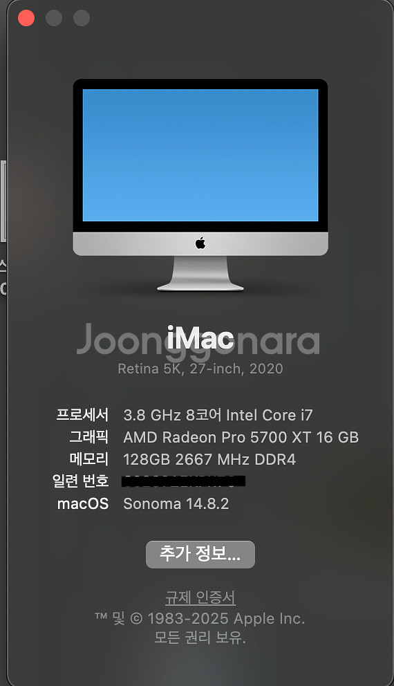 아이맥 27인치 2020년형 판매합니다. 당시 i9 모델은 발열 및 쓰로틀링 이슈가 있어 안정적인 작업을 위해 i7 모델로 선택했고, 그 외 옵션은 모두 상위 사양입니다. 음악 및 영상 작업용으로 구매했지만 구매 직후 회사 입사로 인해 실제 사용량은 많지 않고, 대부분 웹서핑 정도로만 사용했습니다. 최근 소니 FX3 4K 소스로 영상 편집 테스트 진행해보니 타임라인 스크럽 및 실시간 프리뷰도 매우 쾌적하게 잘 돌아갑니다. 고사양 이펙트 위주 작업이 아니라면 아직도 충분히 현역으로 사용 가능한 성능입니다. 현재는 이동 작업을 위해 맥북 환경으로 넘어가게 되어 판매합니다. ✔ 상태 실내 한 곳에서만 사용 (이동 없음) 외관 기스 없음 액정 상태 매우 양호 (사용시간 적음) 박스 상태 좋음 ✔ 디스플레이 27인치 5K Retina 디스플레이로 Apple Studio Display와 비교해도 일반적인 작업 환경에서는 큰 차이를 느끼기 어려울 정도로 뛰어난 품질입니다. ✔ 구성 본체 + 전원케이블 + 박스 (키보드 / 마우스 미포함) 현재 램만 따로 팔아도 100만원 정도 될것 같습니다.. 고해상도 5K 디스플레이 + 안정적인 작업 성능까지 갖춘 가성비 좋은 작업용 아이맥입니다. 용량 1tb ssd 입니다! 서울,안양 인근 지역에서 직거래 가능합니다. 문자로 먼저 연락 부탁드립니다. 010-8968-2073
