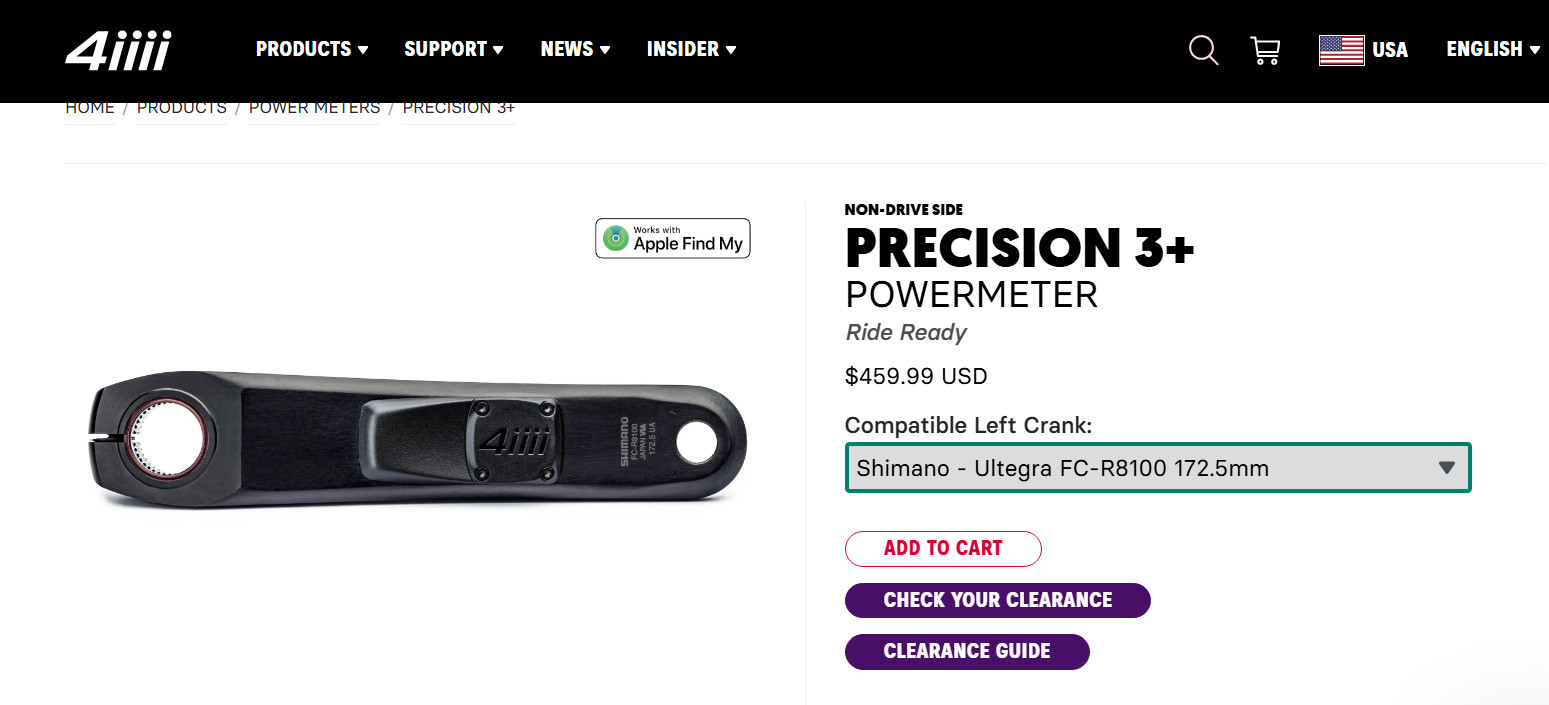 파워미터 판매합니다. 시마노 울테그라 용 172.5 미리 크랭크암 호환입니다. ======================== 브랜드: 4iiii 모델명: 4iiii Precision 3+ 파워미터 (왼쪽 크랭크 암 전용) 호환 구동계: 시마노 울테그라 (Shimano Ultegra) R8100 크랭크 암 길이: 172.5mm 제품 고유 번호 (Part Number): PML300-S18C00X 제품 특징 이 제품은 라이딩 시 사용자가 페달에 가하는 힘(와트)과 케이던스를 측정해 주는 장비로, 시마노 울테그라 R8100 왼쪽 크랭크 암에 파워미터 센서가 부착되어 나오는 완제품 형태입니다. 최대 800시간의 배터리 수명과 애플의 '나의 찾기(Apple Find My)' 기능을 지원하는 것이 특징입니다.