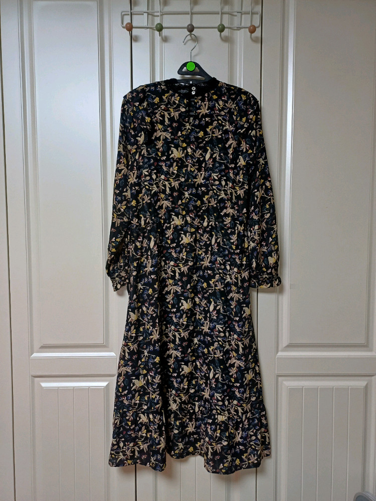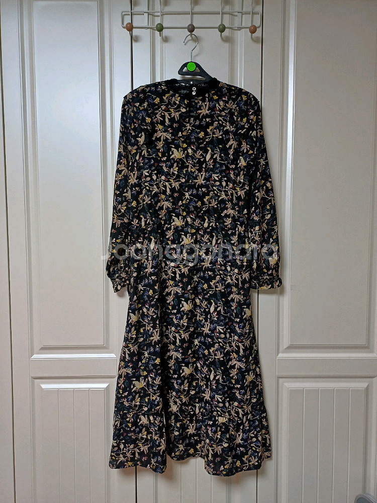써스데이아일랜드 플라워쉬폰롱원피스S사이즈 네이비,베이지.그린 조합의 차분하고 고급스러운 톤 소매,밑단 프릴이 있어 더 여성스러워요 왼쪽옆에 허리 조일수있는 끈있고 안쪽에 속치마 덧대어져있습니다 S사이즈 가슴단면 47 총장 118 cm 착용감 조금외 하자없이 깨끗합니다 드라이완료