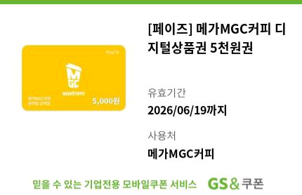 [페이즈] 메가MGC커피 디지털상품권 5천원권 판매합니다 4400원 *상품명 : [페이즈] 메가MGC커피 디지털상품권 5천원권 *쿠폰번호 : 이미지포함 문자전송 *유효기간 : 26/04/20~26/06/19 *사용가격 : 5,000 원 *사용처 : 전국 메가MGC커피 매장에서 사용 가능합니다.