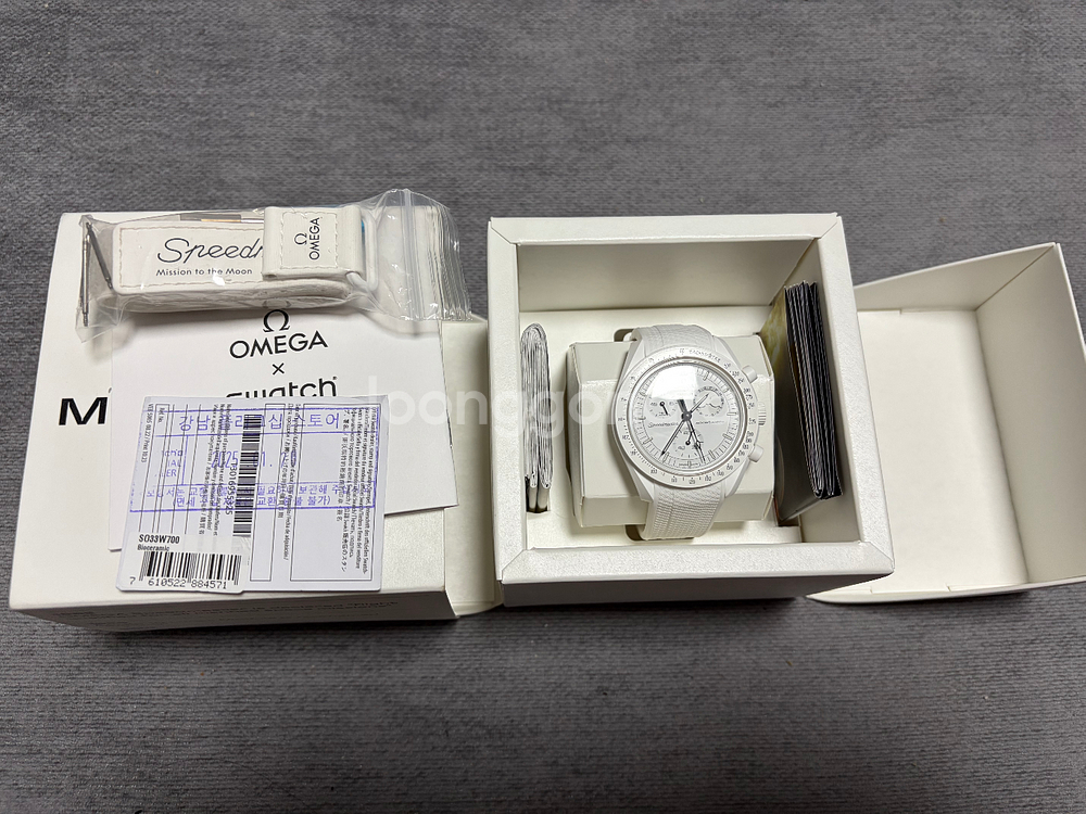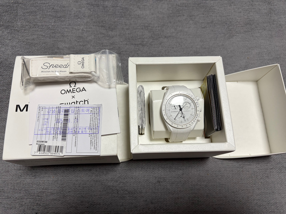 개인정보(거래정보)를 주고받는 행위는 사기에 노출될 수 있으므로 즉시 중고나라로 신고해 주세요오메가와 스와치의 협업으로 탄생한 문스와치 스누피 화이트 모델입니다 사진에서 보시는 것처럼 구성품 모두 포함되어 있으며, 깔끔한 디자인이 돋보여요 정품 스트랩은 반번도 착용한적 없고 알리 스트랩만 채결해서 사용했습니다 25년 1월에 강남에서 구매한 정품입니다