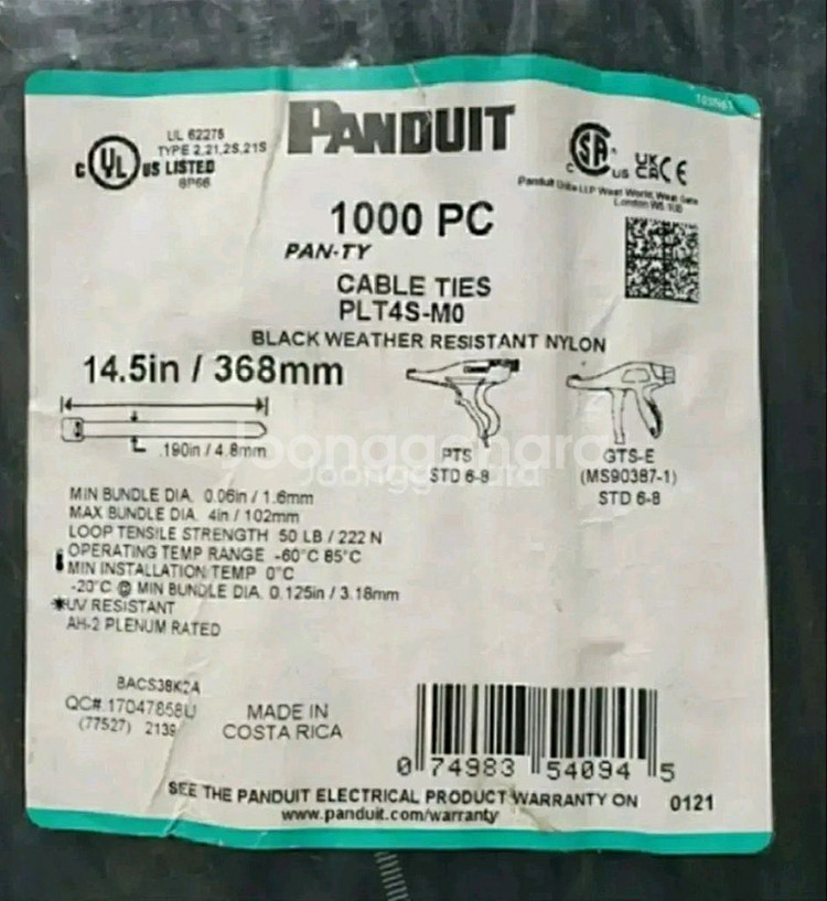 엄청비싼.케이블타이입니다.8만원넘을겁니다.국산타이와는비교불가입니다.세계최고명품케이블타이.미제판듀이트제품.370미리.품질이.국산과차이가많이날겁니다.정말인장력.수명좋습니다.미항공우주국나사.미군부대에서는.판듀이트제품만사용한다고합니다.네고는안받습니다.직거래.CU광명스카이점앞.택배시.택배비3.800원별도.선입금받습니다.뜯어서.몇개사용하고.원래그랬다고우겨.환불해주고.택배비까지손해본경험이있어서요.