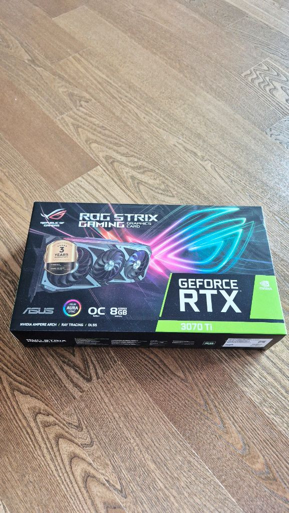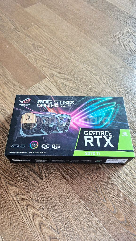 ROG STRIX GAMING RTX 3070Ti 그래픽카드 박스 풀셋입니다. 명실상부 대장급 모델입니다. 보호 필름까지 다 그대로 있는 박스 풀셋이예요. 상태 너무 좋습니다. 연락 주세요~