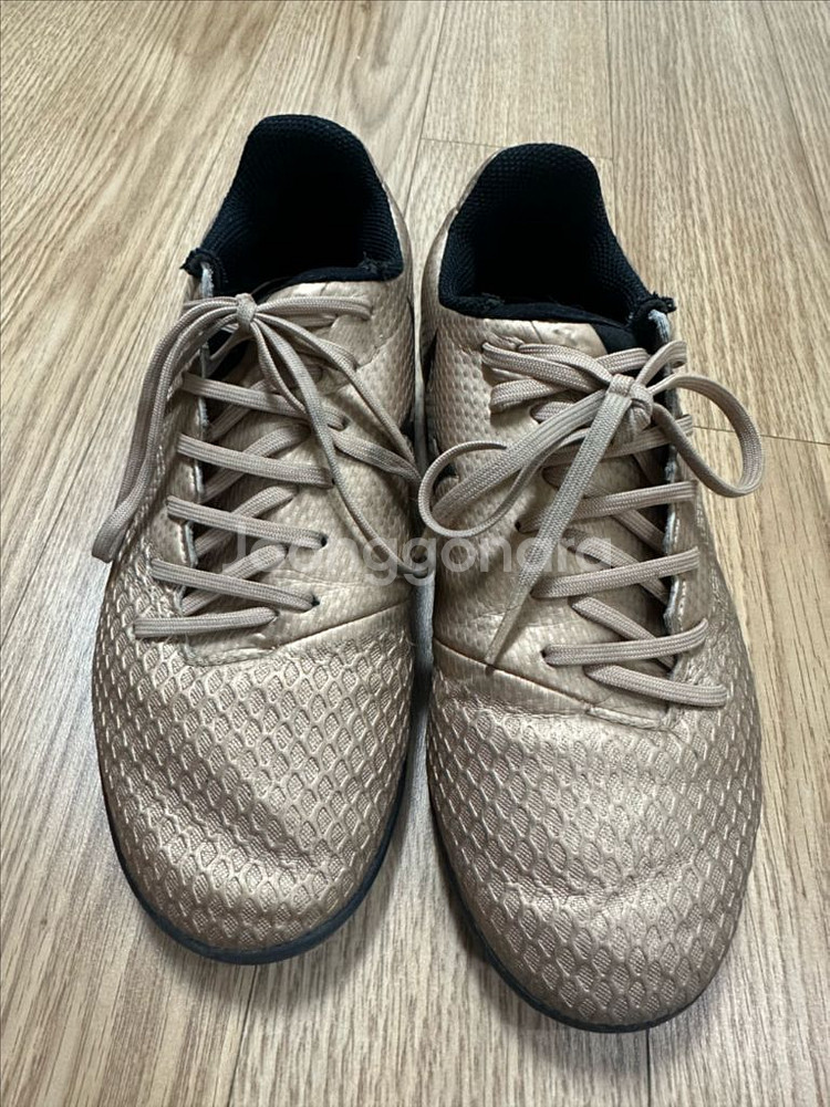 개인정보(거래정보)를 주고받는 행위는 사기에 노출될 수 있으므로 즉시 중고나라로 신고해 주세요아디다스 키즈 메시 16.3 풋살화입니다. 사이즈는 210이고 황금색 갑피가 눈에 띄는 제품입니다.