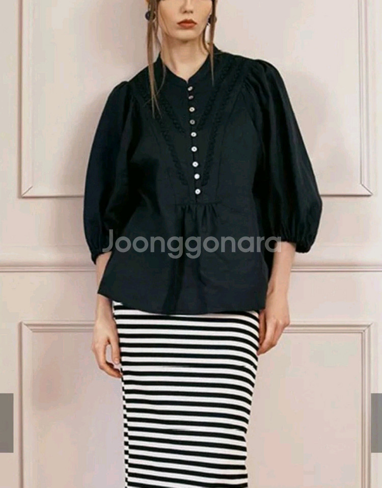 🎯 GS택배 가능합니다. (일반택배 3500원, 반값택배 1900원 추가해 주세요.) 칼라거펠트(Karl Lagerfeld)의 프렌치린넨100% 블라우스입니다. 앞판의 자수 레이스 디테일과 자개단추가 고급스럽습니다. 여유있는 셔링 퍼프 소매가 멋스럽습니다. 블랙 색상으로 66사이즈입니다. 접어두어서 구김 있습니다.