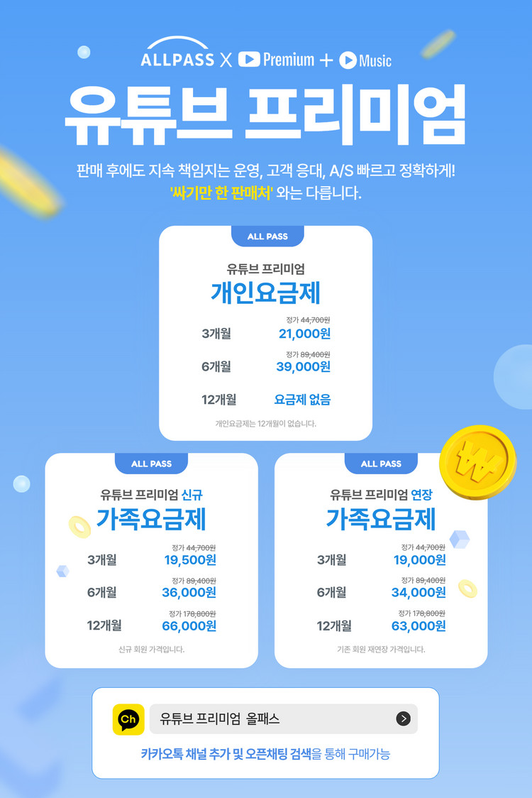 정품 기반, 광고 없이 안정적으로! 판매 이후에도 책임지는 관리! 고객 응대 및 A/S까지 끝까지 책임 타 판매처 대비 빠르고 안정적인 운영 문의는 사진 '하단' 참고해주세요. 깨톡: 유튜브 프리미엄 올패스 <-- 검색하셔도 ㅋrㅋr오 채널 나옵니다.! 후기도 많으니 꼭 들려서 고민되시면 후기 보고 판단하세요! 가족요금제 3개월: 19,500원 6개월: 36,000원 12개월: 66,000원 개인요금제 3개월: 21,000원 6개월: 39,000원