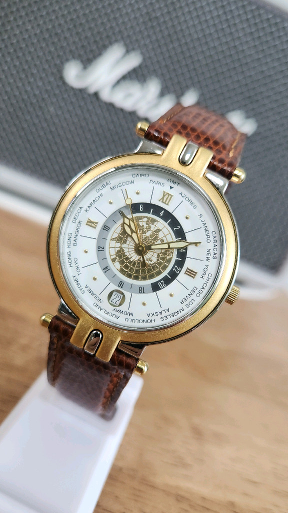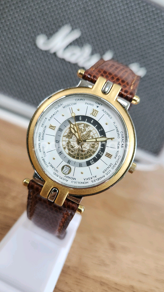 ECCO 에코 빈티지 월드타임 명품시계 입니다. 빈티지 시계에 이당시 이정도 디자인으로 나와줬다는게 경이롭습니다. 콤비 디자인에 다이얼 중간에 세계지도가 금박으로 디자인되어 있어 블링블링 끝판왕입니다. 돈있어도 구하기 힘든 레어중의 레어 아이템입니다. 36mm 크기로 남녀공용입니다. 베터리 있습니다. 사용감 사진클릭하시어 보시면 아시겠지만 세월대비 최고의 상태 유지중입니다. 용두 돌려 세계시간을 세팅하실 수 있습니다. 사진보시면 중간 시간표시가 돌아가는걸 보실 수 있을꺼에요! 시계뿐이라 헐값에 날립니다. 레어 월드타임 워치 놓치지 마세요! ------------------------------ notice ! * 판매자의 물품보기 눌러 다른 제품도 봐주세요! * 사진은 직찍이며 어떠한 보정도 안합니다 * 실측 사이즈를 참고하세요. * 중고물품의 특성상 환불 되지않으니 이점 양해 부탁드립니다 .