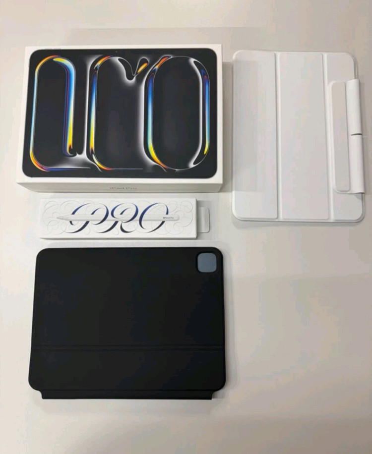 아이패드프로 7세대(M4) 11인치 셀룰러버전 512GB 실버색상 + 애플펜슬프로(C타입) 판매합니다. * 풀박스이며, 아이패드 충전기/케이블은 꺼내보지도 않았습니다. * 배터리 성능 100% 최상 / 사이클 수 44회 입니다. * 구매하고 집에서 가끔 유튜브 보거나 웹서핑용도로만 써서 사용감 거의없습니다. * 항상 케이스 끼워놓고 사용했고, 대부분 집에서만 사용했기에 흠집 없습니다.(떨어뜨린적 없음) * 액정필름 붙여있고, ESR케이스(화이트) / 구조독 A1905 키보드(블랙) / 신지모루 액정필름 1EA 도 함께 드립니다. 펜슬 해지 / 나의 아이폰 찾기 해지 / 아이패드 초기화 모두 완료 상태입니다! 직거래 강원도 고성 택배되시지만 안결은 어렵습니다!!