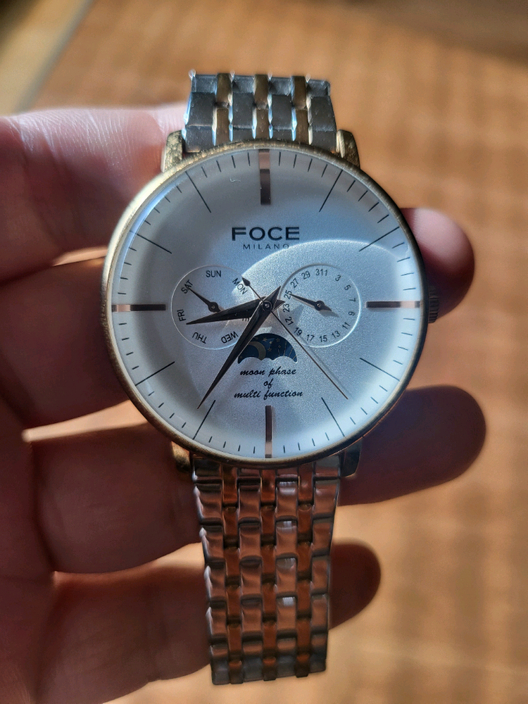 포체 금장 시계 판매합니다. 은색 바탕에 금색으로 포인트 줘서 고급스러워요. 문페이즈 기능도 있어서 유용하게 쓰실 수 있습니다. 40미리 사이즈구요 정상작동합니다 판매시 배터리 새로 교체해서 보내드립니다 줄길이가 17.5~18정도 됩니다 사이즈가 적당해서 알큰거 좋아하시는 여성분이 차셔도 괜찮을듯 합니다 시계단품이며 일반시계케이스에 넣어서 보내드립니다 대구 직거래 환영 중고 특성상 제품하자 외 변심 등으로 인한 교환ㆍ환불 불가입니다