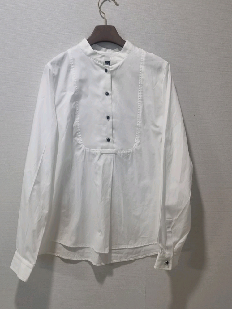 A.P.C 아페쎄 화이트 블라우스입니다. 심플하면서도 고급스러운 디자인으로 데일리/출근룩 모두 잘 어울립니다. 넥라인 버튼 디테일과 자연스럽게 떨어지는 핏이 예쁜 제품이에요. 면 100% 소재로 착용감 좋고 사계절 활용 가능합니다. 화이트 컬러 특성상 미세 사용감은 있을 수 있으나 전체적으로 깔끔한 상태입니다. 사이즈 36 (국내 55 -마른66) 가슴단면 49cm / 총장 64cm 국내정품입니다.