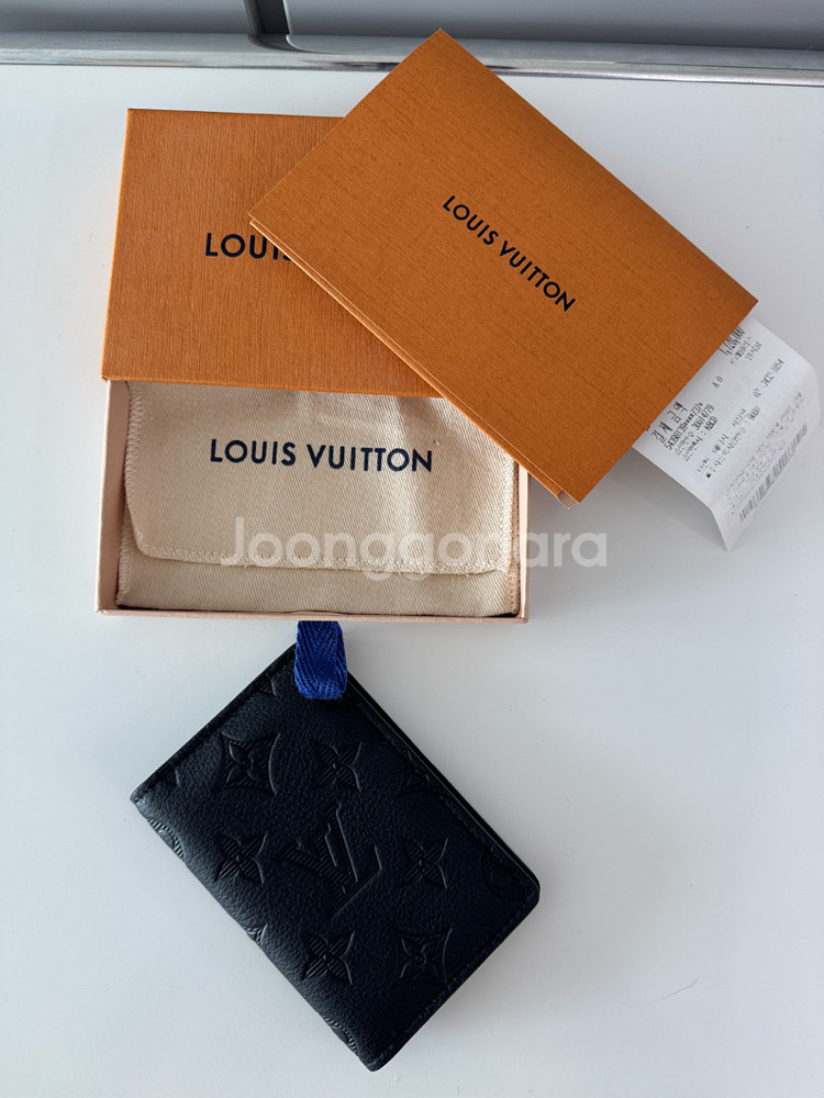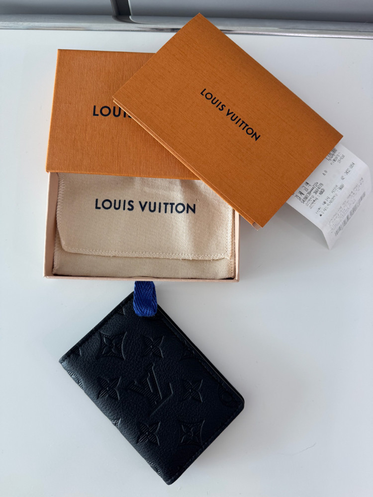 루이비통 포켓 오거나이저(카드지갑) (모델명 검색 안되서 블랙 있는거 아무거나 체크함) 블랙 색상 24년8월 구매 안쓰는 카드 넣어두는 용도로 쓴거라 외부에 가지고 다닌건 3회정도라 외부 스크레치 전혀 없고 카드 넣어둔자리만 사용감 있습니다 모노그램 무늬도 잘 맞는걸로 매장에서 고심해서 골랐습니다 구성품 박스 더스트 쇼핑백 가격표 영수증 영수증에는 티셔츠랑 같이 구매한거라 총 금액이 찍혀 있습니다 현재 판매가가 80만원이더라구요 저렴하게 데려가세요 타 플랫폼 거래 안합니다