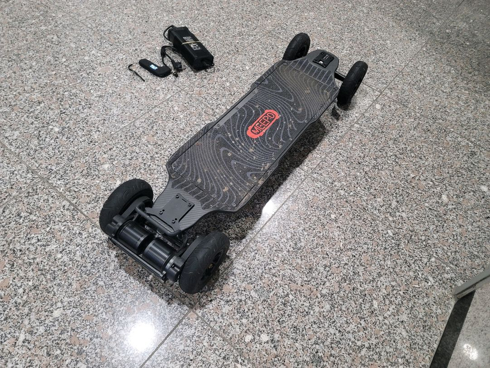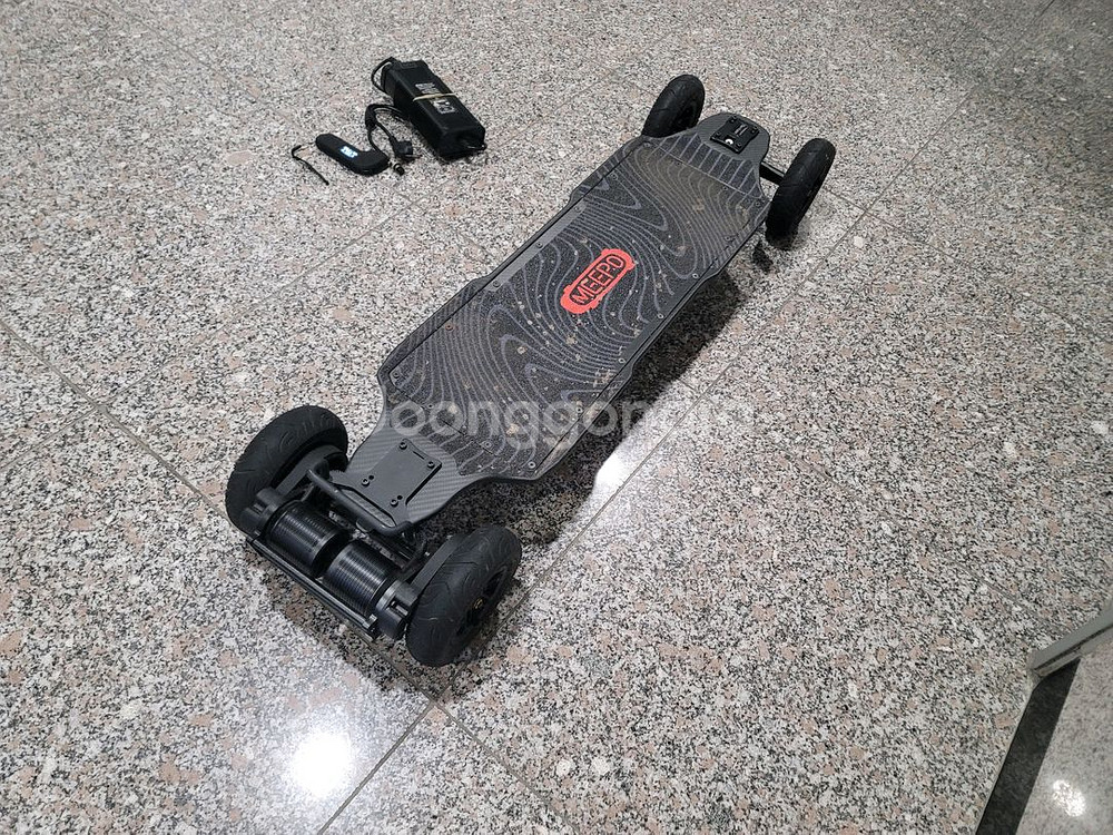 Meepo Hurricane 미포 허리케인 전동스케이트보드 입니다. 사진 처럼 상태 괜찮습니다. 원래 듀얼 모터인데 갑자기 한쪽 모터 작동이 안됩니다. 어떤 문제인지는 모르겠습니다. 잘 아시는분이 픽업해 주세요. 총 주행거리는 50마일 정도 입니다. 구성품은 리모컨, 충전기, 커버케이스 구성 입니다. 추가로 4번째(왼쪽) 전동스케이트보드 필요 하시면 30만원에 드립니다. 작동은 잘되고 충전기, 리모컨, 커버케이스 포함이고 스펙은 알지 못합니다. 잘 아시는분 구입해 가시면 됩니다. 전달은 서울 강서구 마곡동에서 가능하고 택배는 어렵습니다. 네고 문의 사절하고 바로 픽업 가능하신분만 연락 주세요. 채팅 답변이 늦으면 O1O 76O4 168O 으로 연락 주세요