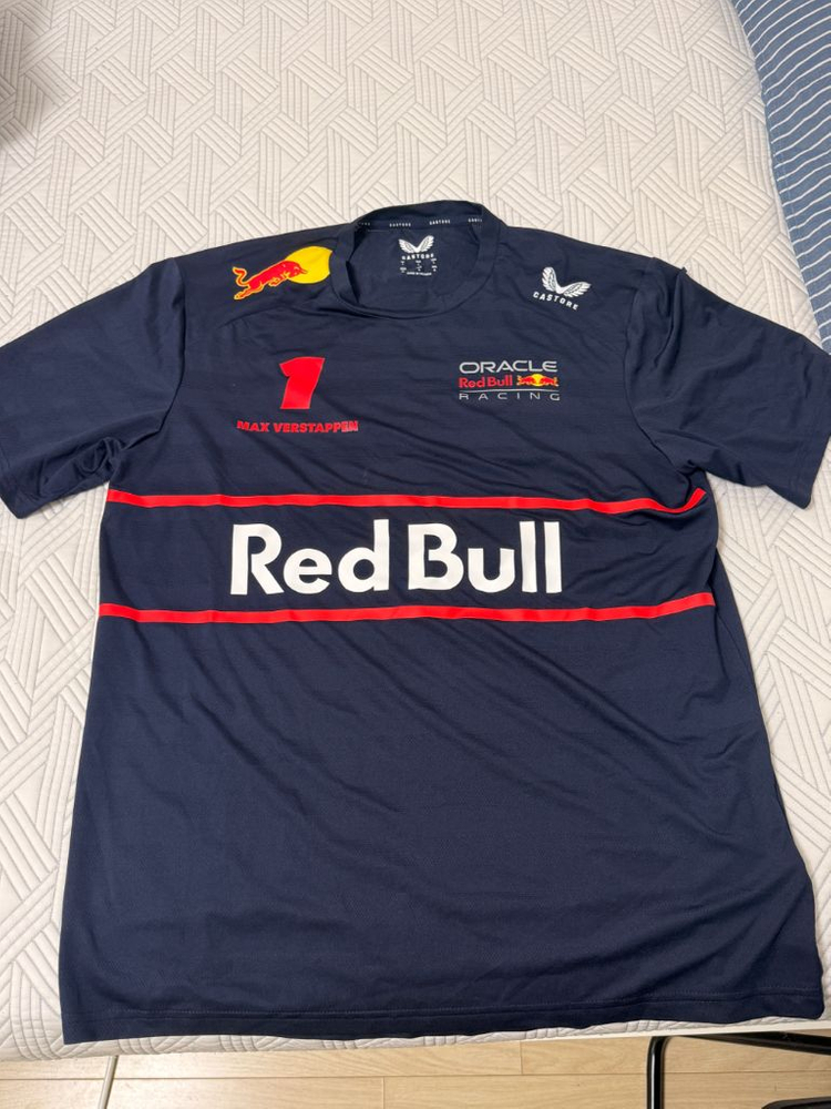 레드불 레이싱 팀의 맥스 베르스타펜 유니폼이에요 오라클 레드불 레이싱 로고와 맥스 베르스타펜 이름이 새겨져 있어요 선명한 레드불 로고와 깔끔한 디자인이 돋보이는 제품이에요 레이싱 팬이라면 소장 가치가 높은 아이템이랍니다 택은 없습니다.