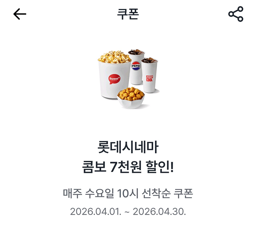 롯데시네마 앱에 등록하셔서 할인받을수 있는 쿠폰입니다. 유효기간:~26.04.30