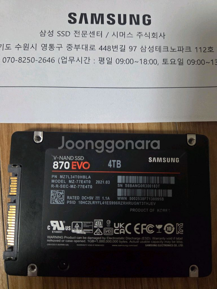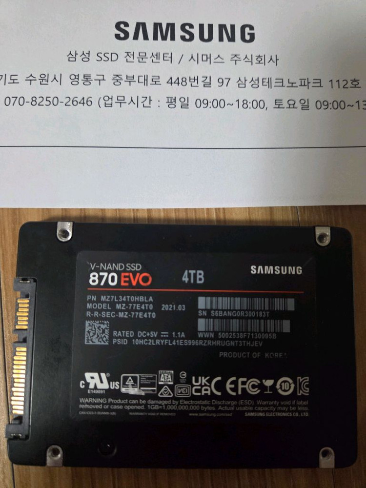 EVO 870 4TB 판매 삼성 한국 정식 발매 된 정품입니다 현재 신품가격이 200만원에 형성되어 있고 4월말부터 또 인상됩니다 고가의 제품이니 삼성SSD 정상 판정과 한국 정발 여부 꼭 확인하고 사세요 보증기간도 남아 있어서 혹시나 문제가 생겨도 삼성SSD정책상 새제품 교환이니 안심하고 구매하세요 사용량이 많아 시세보다 싸게 팝니다 외장케이스나 SATA to USB 필요하시면 구매전 말씀하시면 챙겨 드릴게요 재할당된 섹터 23개는 삼성SSD전문센터로 검증 요청 및 문제 없음 판정 받았습니다 (판정서 같이 동봉드림) 못쓰는 용량은 11.7KB로 극히 미비 2개월 보증기한 남은 한국 정발 정품이며 삼성 마크가 없는건 100% 알리산 짝퉁입니다 해외직수품은 국내 AS나 보증 불가니 잘보고 사세요 사연 있는 네고 환영합니다 ^^ 안전거래 선호합니다