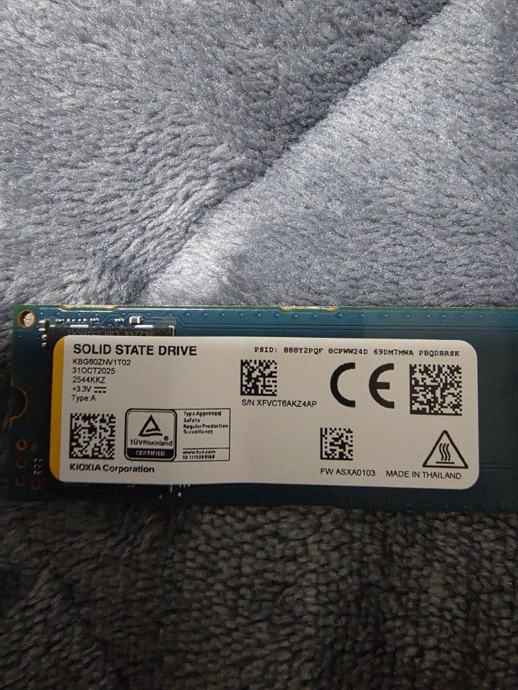 키오시아(구 도시바)의 최신 6세대 BiCS FLASH가 탑재된 고성능 PCIe 4.0 SSD입니다. ASUS 젠북 듀오 2026 어제 받고 바로 업글하면서 빼둔거라 신품에서 적출한 미사용 제품 모델명: KIOXIA KBG60ZNV1T02 (BG6 시리즈) 용량: 1,024GB (1TB) 인터페이스: PCIe Gen4 x4 (NVMe 1.4c 지원) 폼 팩터: M.2 2280 전송 속도: * 순차 읽기: 최대 6,000 MB/s 순차 쓰기: 최대 5,300 MB/s HMB 지원: HMB(Host Memory Buffer) 기술을 통해 시스템 메모리를 캐시로 활용하여 빠른 속도 유지 저전력/저발열: 전력 효율과 발열 관리가 뛰어남 제조일자: 2025년 10월 31일 (최신 제조)