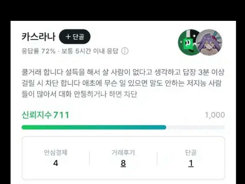 [핵심 요약] • 권고 사항: 해당 닉네임과 거래 중이거나 계획이 있다면 즉시 중단해주시기 바랍니다. 번개장터: Flamescion 중고나라&당근마켓: 카스라나 디스코드(#음향기기-삽니다): Sirin155 •권고 사유: 1. 저렴하게 매물을 구매 후 즉시 높은 가격으로 재판매 하는 전문 업자입니다. 2. '더치트'에 등록된 이력이 있는 유저임. 3. 계좌 이체를 요구합니다. 구매자분들께서 구매하신 물품들은 여러 소유자를 거쳐 판매된 품목입니다. —아래 품목들은 되팔이가 확인된 품목들입니다.— 상품명: 수월우 메테오 급하게 팝니다 •1차 거래 (번장): 판매자 ‘힘멜리우스’ -> 구매자 ‘Flamescion’ 판매 완료 260,000원 •2차 거래 (번장, 당근, 중나): 판매자 ‘Flamescion’ -> 구매자: ‘미정 판매 중 270,000원+배송비 6,000원 (초기에 360,000원으로 판매 중이였습니다.) —— 상품명: 아우네유키 Dac (tdhu님 인증 완료) •1차 거래 (번장): 판매자 ‘tdhu’ -> 구매자 ‘Flamescion’ 판매 완료 85,000원 •2차 거래 (번장, 당근, 중나): 판매자 ‘Flamescion’ -> 구매자: ‘미정 판매 중 130,000원 + 배송비 6,000원 & 상품명: AFUL 이어폰 퍼포머 AFUL Performer 5+2 급처 (tdhu님 인증 완료) •1차 거래 (번장): 판매자 ‘tdhu’ -> 구매자 ‘Flamescion’ 판매 완료 150,000원 •2차 거래 (번장, 당근, 중나): 판매자 ‘Flamescion’ -> 구매자: ‘거래 후기 없음으로 확인 불가‘ 판매 완료 200,000원 + 배송비 6,000원 —— 상품명: 수월우 메이 이어폰+알리발 커스텀 케이블 (###님 인증 완료[모자이크 요청 부탁] •1차 거래 (중나): 판매자 ‘###‘ -> 구매자 ‘Flamescion’ 판매 완료 ‘가격 확인 예정’ 원 •2차 거래 (번장, 당근, 중나): 판매자 ‘Flamescion’ -> 구매자: ‘거래 후기 없음으로 확인 불가‘ 판매 완료 80,000원 + 배송비 6,000원 & 상품명: HIDIZS MP145 실버 이어폰, ADV 꼬다리 DAC 일괄 (###님 인증 완료[모자이크 처리]) •1차 거래 (당근, 중나): 판매자 ‘###‘ -> 구매자 ‘Flamescion’ 판매 완료 110,000원 •2차 거래 (번장, 당근, 중나): 판매자 ‘Flamescion’ -> 구매자: ‘미정‘ 판매 중 150,000원 + 배송비 6,000원 & 상품명: 수월우 던프로 dac (###님 인증 완료[모자이크 처리]) •1차 거래 (당근, 중나): 판매자 ‘###‘ -> 구매자 ‘Flamescion’ 판매완료 35,000원 •2차 거래 (번장, 당근, 중나): 판매자 ‘Flamescion’ -> 구매자: ‘미정‘ 판매 중 50,000원 + 배송비 6,000원 ###님이 말씀해주시기로는 지인 분들의 매물도 그대로 올렸다고 말씀해주셨습니다. —— 상품명: 수월우 블레싱 •1차 거래 (번장, 중나): 판매자 ‘확인 불가‘ -> 구매자 ‘Flamescion’ 판매 완료 250,000원 •2차 거래 (번장, 당근, 중나): 판매자 ‘Flamescion’ -> 구매자: ‘거래 후기 없음으로 확인 불가‘ 판매 완료 300,000원 + 배송비 6,000원