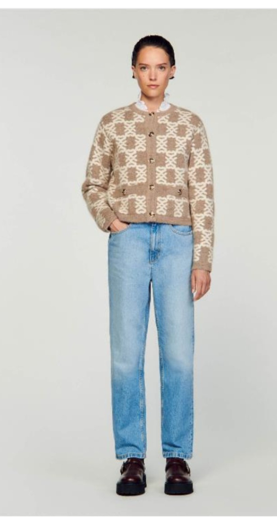 산드로(SANDRO) 니트 가디건입니다. 브라운+아이보리 자가드 패턴으로 고급스럽고 금장 버튼 포인트로 단정하면서도 포인트 되는 제품이에요. 울 혼방 소재로 부드럽고 따뜻하게 입기 좋습니다. (울 59% / 폴리에스터 41%) 크롭 기장감으로 슬랙스, 스커트 어디에나 매칭 쉬워요. 전체적으로 상태 깔끔한 편입니다. 60만원 올해구매 입기좋고 산드로로고패턴입니다! 가슴단면 50cm 총장 55cm 사이즈 2 (국내 55~66 추천)
