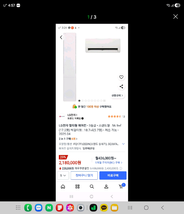 개인정보(거래정보)를 주고받는 행위는 사기에 노출될 수 있으므로 즉시 중고나라로 신고해 주세요LG전자 듀얼 인버터 스탠드에어컨 FQ17FUZEON 모델이에요 2등급 스탠드형으로 17.2평형까지 커버 가능해요 냉방 능력 18.7m², 제습 가능해요. 스탠드 17평 벽걸이 6평 입니다. 전시설치만한 새상품이나 마찬가지에여 작년7월이후 모델입니다
