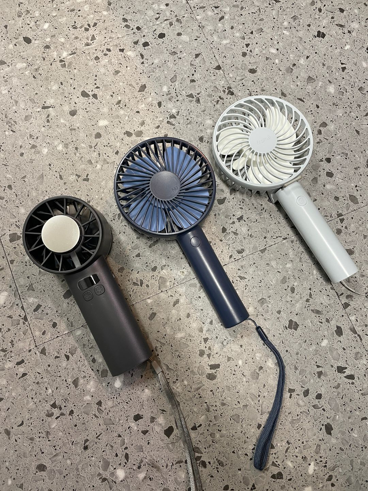 휴대용 선풍기 일괄 : 3만원 좌측부터 첫번째 모델은 펠트 냉각 소재가 들어간 제품으로 금속부분 엄청 차가워 지는 모델입니다. (새제품) 두번째 모델은 국내에서 구입한 오난코리아 제품이며 보관상 문제로 스크래치는 있습니다만 잘 작동합니다. (중고) 세번째 모델은 프롬B 제품으로 국내에서 구입한 헤드부분이 꺽이는 제품 입니다.(새제품) 일괄로 판매 합니다.
