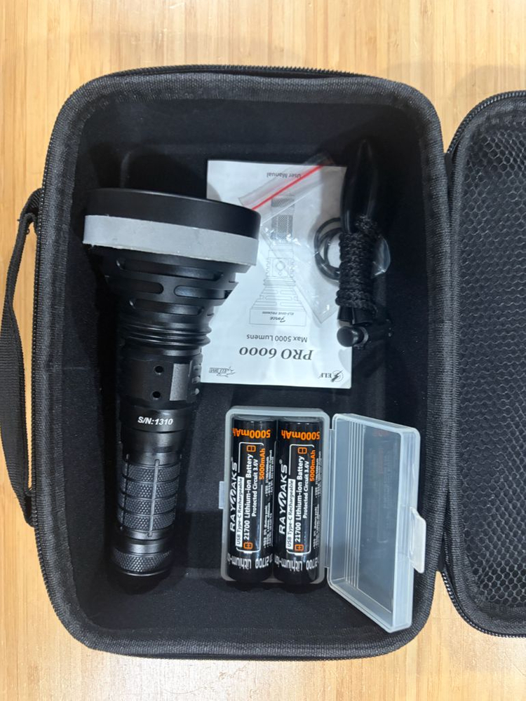 엘프 프로 6000 다이빙 렌턴과 충전지 2개입니다. 렌턴은 올 해 초에 구입해서 1회 투어에서만 사용하었고 충전지는 구입한지 좀 되었는데 사용은 투어 4~5회 정도입니다. 전용케이스 내부 인서트는 버렸고, 사진에 보이는 회색 반사띠는 제가 붙였는데 불필요하시면 제거하고 드리겠습니다.