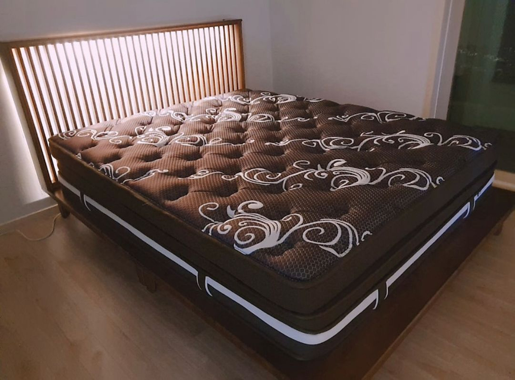 창살형 프레임이고, 조명이 있어서 별도의 협탁 조명없이 분위기를 낼 수 있어요 나무색 자체가 고급진 월넛 색상입니다 보통 조립식 프레임은 조립부분의 아귀가 안맞거나 움직이면 삐걱대는 경우가 있는데, 이 프레임은 원목이라 튼튼하고 안정감 있고, 삐걱거리는 소리 없어요 사진에있는 매트리스는 킹사이즈이고, 퀸도 올릴 수 있어요 높이는 로봇청소기가 지나다닐 수 있는 높이입니다 21년도에 파주 가구단지에서 구매했고, 잔기스는 있어요. 중고인 점 감안해주세요~ 5/7일 이사하는 날 1층에 내려드릴 수 있어요