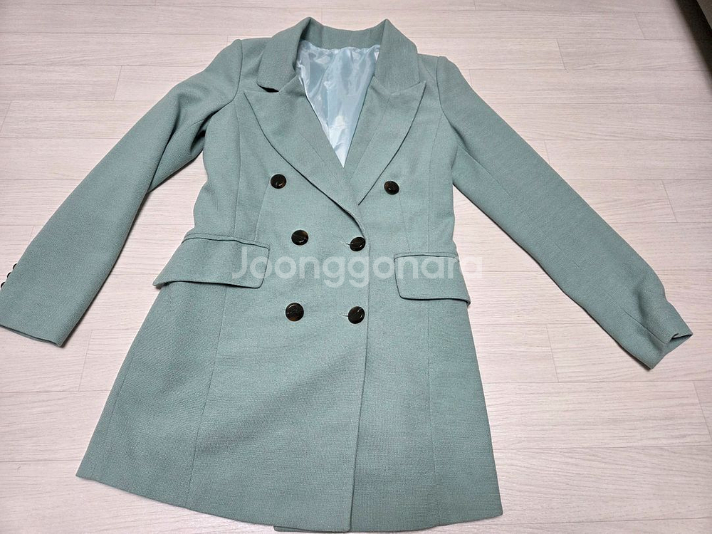 개인정보(거래정보)를 주고받는 행위는 사기에 노출될 수 있으므로 즉시 중고나라로 신고해 주세요깔끔한 민트색 더블 버튼 자켓이에요 사진에서 보이는 것처럼 고급스러운 디자인이 돋보여요. 가슴단면 48cm, 총장 78cm정도라 66까지 예쁘게 맞으실듯해요. 조금 사용감있지만 깨끗해요.