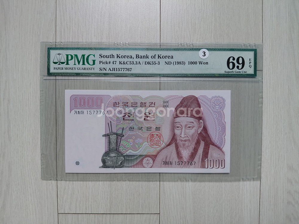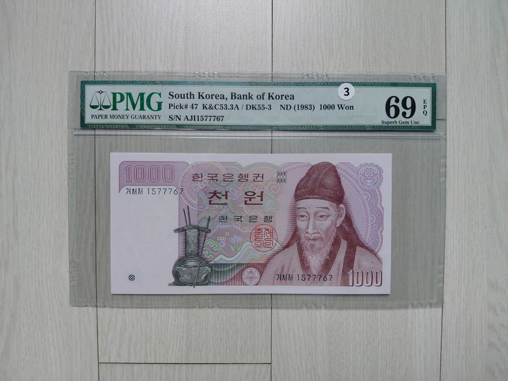 . " (택배) (우편) " " 개인간 [계좌이체] " 거래 (불)가능 합니다 " 지폐 " (그레이딩) 은 [전세계적으로] 인기 있는 믿을수 있는 오직 미국 ● [ PMG ] ● " (만) " 취급 합니다 직거래] 69 (초고)등급 [PMG] (그레이딩) 지폐 " ■ (직) 거래 ■ " 가능 하신분 (만) (직) 거래 하실분은 " 서울 지하철 3호선 (녹번역) " 에서 지금 " 바로 " 거래 합니다 1983년 [ 한국은행 ] 2차 천원 69 초고등급 ( 완전 미사용 ) ( 그레이딩 ) 지폐 지금으로부터 43 년 (전) 인 1983년 [ 한국조폐공사 ] 에서 제조 되었던 ( 한국은행 ) 에서 발행 유통 되었던 이제는 통용 되지 않는 " 단종 " 된 [ 대한민국 ] 지폐 로 [ 전세계에서 ] ( 지폐 ) 감정 평가 로 " 제일 " 인정 받고 있는 [ 미국 ] PMG ( 그레이딩 ) 에서 70 등급 (만점) 에 69 (초고) 등급 (획득) 하기는 쉽지가 (않) 습니다 거기에다 동시에 [ 대한민국 ] " 단종 " " 지폐 " 로 (총) 7 자리 지폐 번호 에서 " 행운 " 숫자 (인) 7 숫자 가 [ XX 777 X 7 ] 4 자리 (포함) 된 " 7 트리플 + 7 " 이런 [ 대한민국 ] ( 단종 ) 된 지폐를 미국 PMG ( 그레이딩 ) 69 (초고) 등급 지폐로 [ 시중에서 ] 구하기도 매우 어렵습니다 상기 (실물 그대로) (앞/뒤) (실물) 사진 자세히 보시고 거래 (후) (반품) " 불가 " 합니다 .