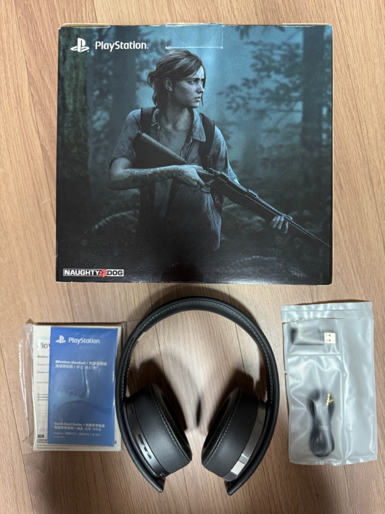 [풀박스] 플스 골드 무선 헤드셋 라스트 오브 어스 2 에디션 (PS4/PS5 호환) 플레이스테이션 공식 골드 무선 헤드셋 '라스트 오브 어스 파트 2' 리미티드 에디션 판매합니다. 박스 포함하여 헤드셋 본체, 무선 USB 전용 동글 등 구성품 모두 있습니다. (충전은 마이크로 5핀 케이블로 하시면 됩니다.) 헤드셋 바깥쪽 음각 로고나 헤어밴드 외관은 아주 깨끗합니다. 플스4는 물론이고, 플스5나 플스5 프로 전용으로만 쓰셔도 공식 3D 오디오를 완벽하게 지원해서 성능이 충분히 좋습니다. 다만 사진에서 보실 수 있듯 이어패드 안쪽 가죽이 살짝 벗겨지는 현상이 있습니다. (해당 모델 종특입니다.) 사용하시는 데 기능상 문제는 전혀 없지만, 신경 쓰이시는 분들은 네이버나 알리에서 호환 패드(약 5천 원~1만 원대)만 따로 구매해 교체하시면 완전 새것처럼 쓰실 수 있습니다. 이 부분 감안해서 저렴하게 가격 책정했습니다. 편하게 채팅 주세요!