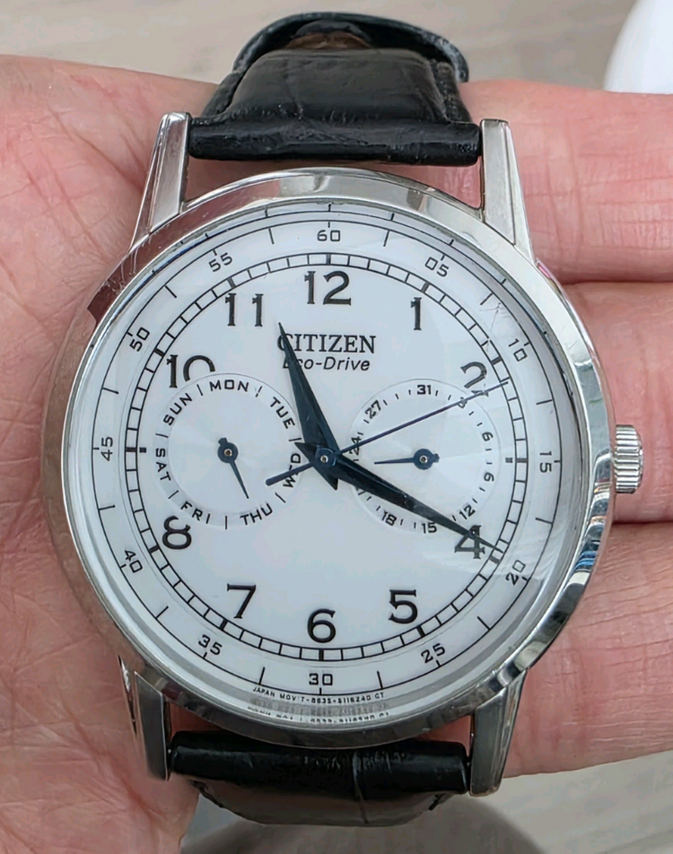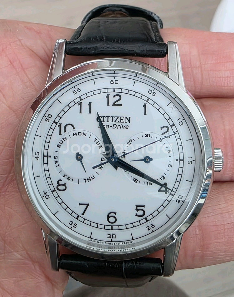 시티즌 (CITIZEN) 부엉이 흰판 블루핸즈 데이 & 데이트 솔라 에코드라이버 시계 빛과 태양광으로 충전되는 에코드라이버 시계입니다. > 원산지 : 일본생산 쿼츠 > 에코드라이버 태양광원 > 모델 : AO9000-06B > 스테인레스 스틸 케이스 > 악어가죽 블랙 스트랩 > 케이스 직경 : 42.0 mm > 케이스 두께 : 11.0 mm > 방수 : 3ATM 30m ※ 유리에 흠 전혀 없고 사진과 같이 경미한 생활감에 있지만 작동 잘 하고 깨끗한 시계입니다. 시계단품이라 저렴하게 판매합니다. 》택배거래시 일반+4.5천원, 반값+2.5천원 추가입금. (미입금 착불배송) 》저렴한 상품으로 교환, 환불 불가하며, 예민한분은 구매자제 바랍니다. # 팔로우 하신분 ♤Thanks!!