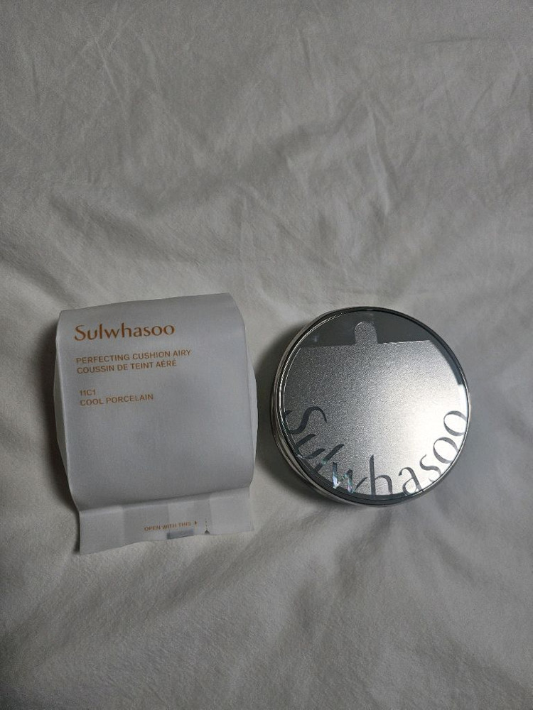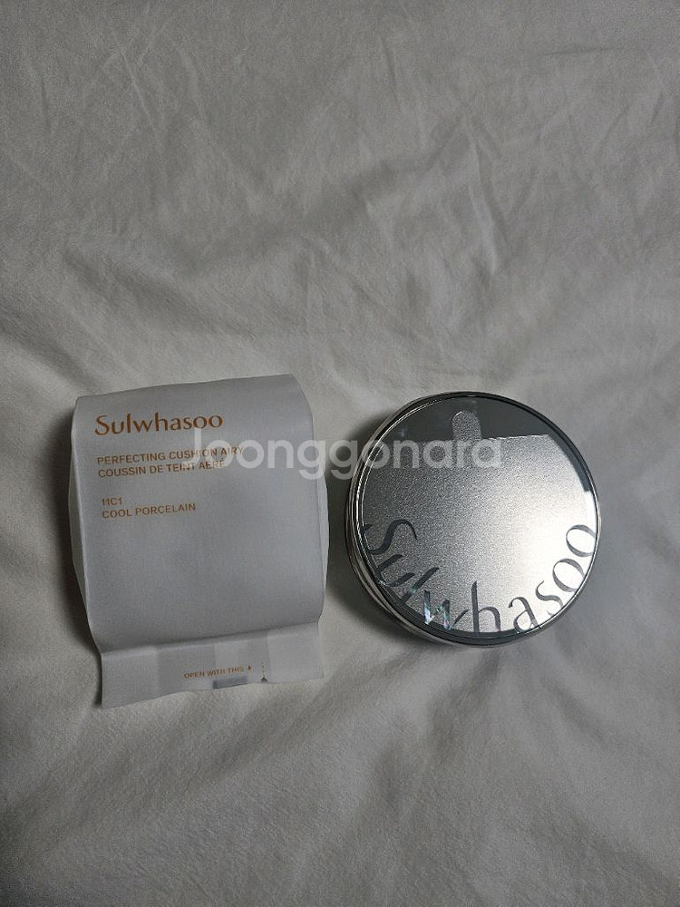 설화수 퍼펙팅 쿠션 에어리 (11C1 / 쿨 포슬린 색상) 미사용 새상품 팝니다. 본품 + 리필 1개가 같이 들어 있어요. 30g으로 (15g ×2) 입니다. SPF50+ (PA+++) 로 자외선 차단 기능있고, 화사하고 맑은 피부 표현을 원하시는 분들께 추천드려요. 정가 89,000원 이고 씰 및 포장 안 뜯었고, 사용기한 2027.03.05 까지 입니다. 변심으로 환불은 안되니 신중한 구매 부탁드려요!
