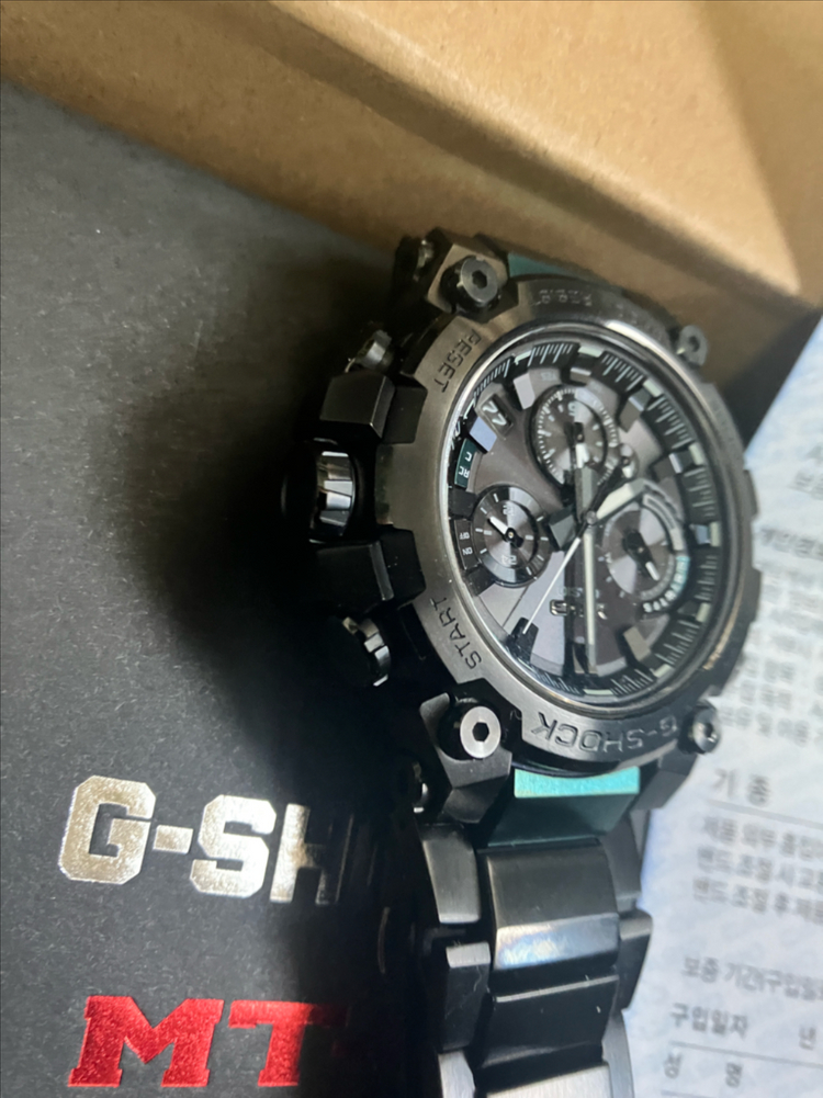 MTG 모델을 여러개 보유하고 있지만 B3000모델에 블랙+ 그린 포인트 있고 깔끔합니다 어떤 스타일에도 잘 어울리는 매력적인 시계랍니다 카시오 지샥 MTG-B3000BD 카본 모델이에요 블랙 , 카본 코어 모델로 일반 B3000 블랙보다 멋스럽고 고급스럽습니다 특별한 흠집들 없고 아껴서 착용하여 상태 좋습니다 여름이라 태양광충전, 200미터 방수, 위성 시간 자동맞춤, 충격보호 등 기술의 집합입니다 남성들의 다이나믹한 환경에서 언제나 든든합니다