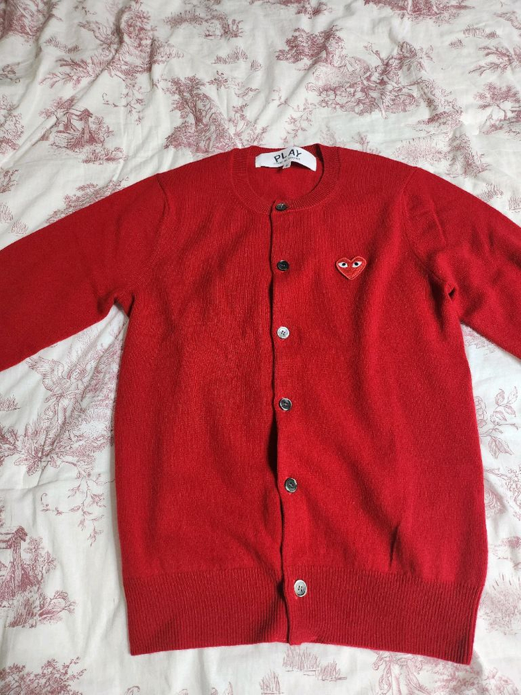 ㅡ꼼데가르송 가디건 ㅡ레드컬러 ㅡs사이즈 넉넉한 사이즈 레드 와펜이 예쁜 꼼데가르송 가디건입니다. 병행수입 제품 정품이라하여 구입했는데 정품여부 몰라 저렴히 내놓습니다. 택을 떼어 반품 못하고 저렴히 보냅니다. 완전 새상품입니다. 컬러 너무 예쁜 레드컬러입니다. 낙낙한 s사이즈(55-77사이즈)롱한 길이 새상품입니다. 꼼데가르송 가디건 저렴히 데려가시는겁니다. 노리턴