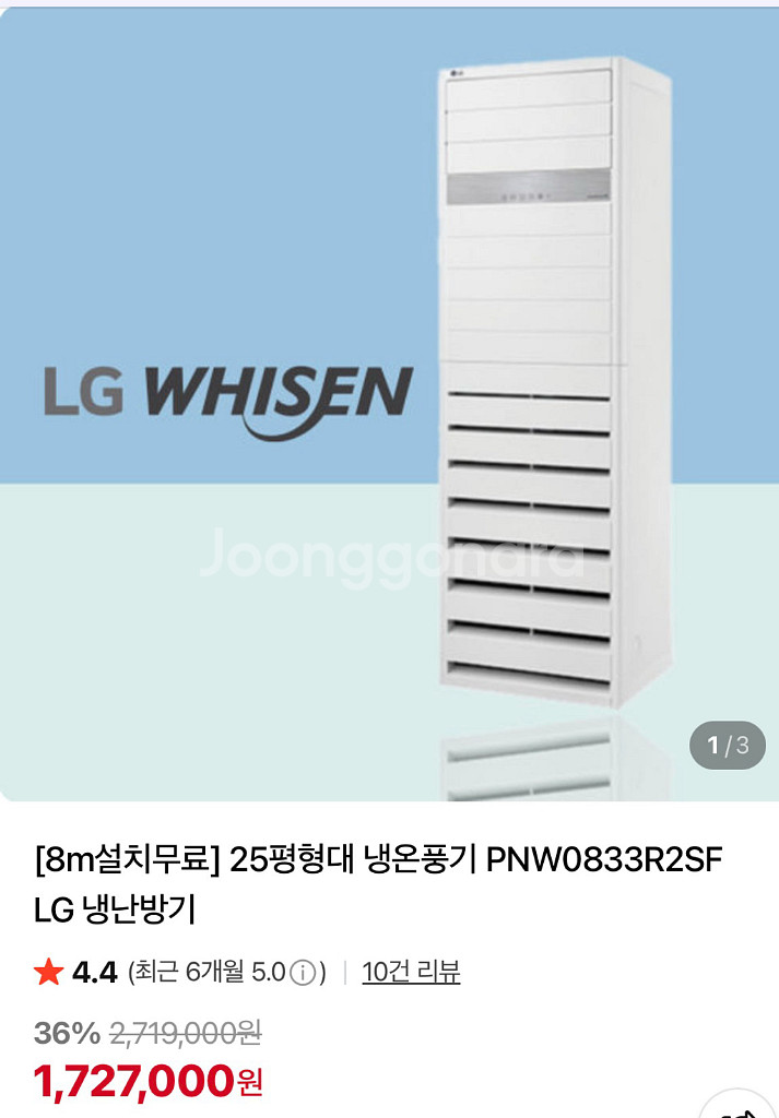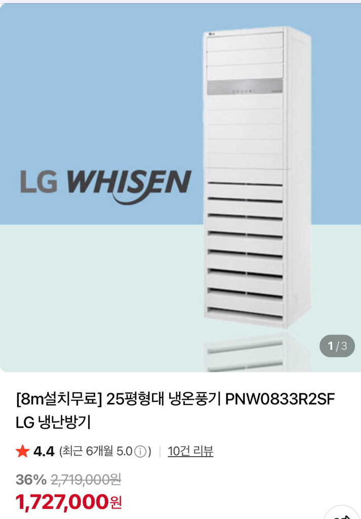 개인정보(거래정보)를 주고받는 행위는 사기에 노출될 수 있으므로 즉시 중고나라로 신고해 주세요LG 휘센 25평형 냉난방기 PNW0833R2SF 판매합니다. - 실사용 1개월 미만 - 냉방과 난방 모두 가능합니다. - 스마트 인버터 기능으로 에너지 효율이 뛰어납니다.