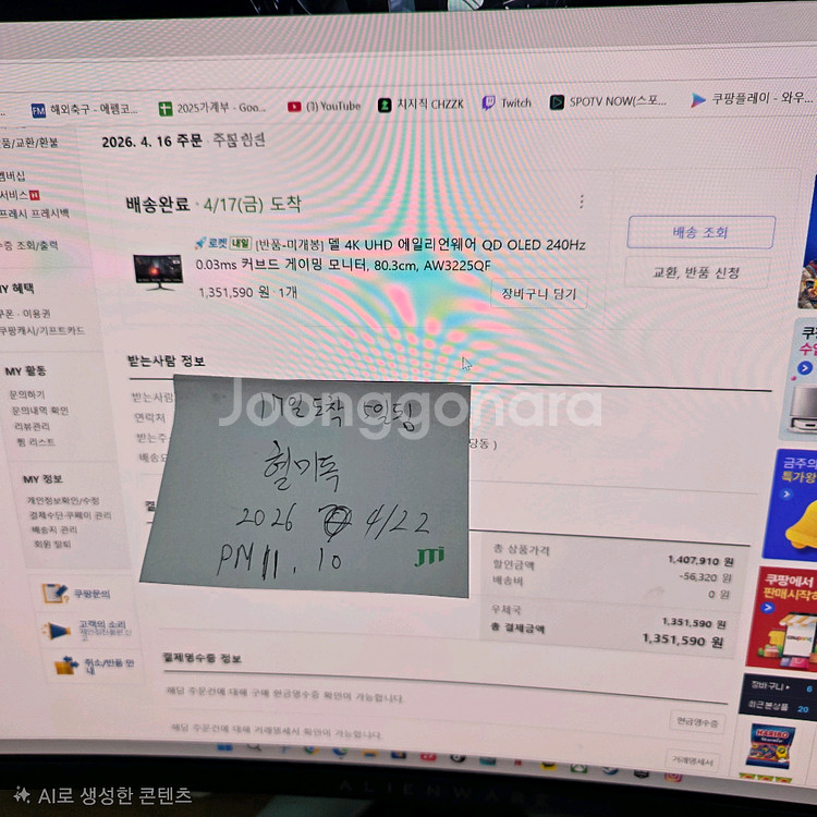 델 4K UHD 에일리언웨어 QD OLED 240Hz 0.03ms 커브드 게이밍 모니터 요근래 산 모니터이고 그냥 쓸까 말까 고민중에 팔고 다른 모니터로 교체할려고요 구성품은 사진에 없지만 창고에 그대로 박스랑 다 있습니다 4k화질이라 아주 좋아 패널 상태 번인이나 결점 없음 단지 그전에 쓰던 모니터 qhd 34인치랑 더 큰 모니터 원해서 파는거입니다 중고거래만큼 네고 반품 환불 불가입니다 아주꼼꼼하게 보내 드립니다. 택배비 포함 90에 팔아요 중고거래에서나 플리마켓에서만 거래 합니다 이모니터 스펙 패널 종류 3세대 QD-OLED (삼성 패널) 화면 크기 31.6인치 (약 80cm) 해상도 3840 \times 2160 (4K UHD) 주사율 240Hz 응답 속도 0.03ms (GtG) 곡률 1700R (완만한 커브드) 밝기 250cd (일반) / 1000nits (HDR 피크) 색재현율 DCI-P3 99% / Delta E < 2 (매우 정확한 색감) 주요 기능 Dolby Vision, NVIDIA G-SYNC Compatible 단자 구성 DP 1.4, HDMI 2.1 (eARC 지원), USB 3.2 포트 등 AS 보증 3년 무상 하드웨어 보증 (번인 포함)