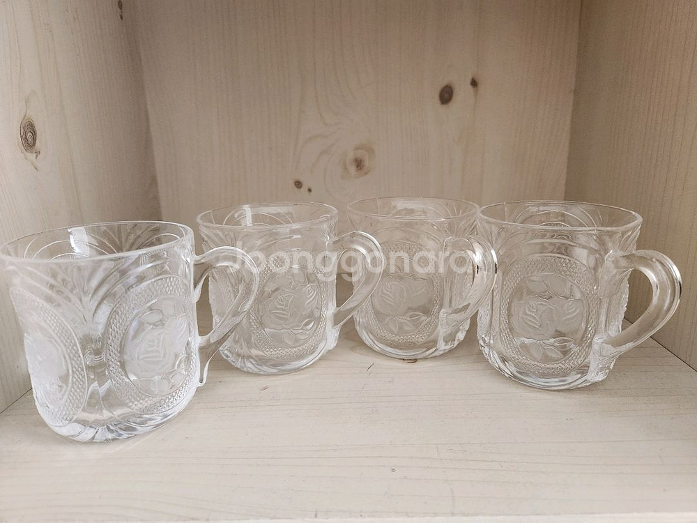 빈티지 로즈 무늬가 들어간 투명 유리컵입니다. 높이8.5cm 지름7cm 4개입니다