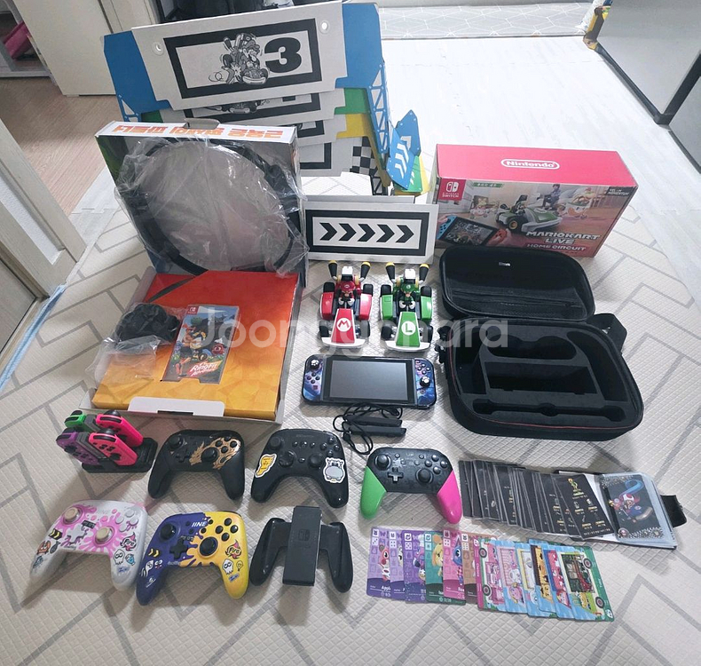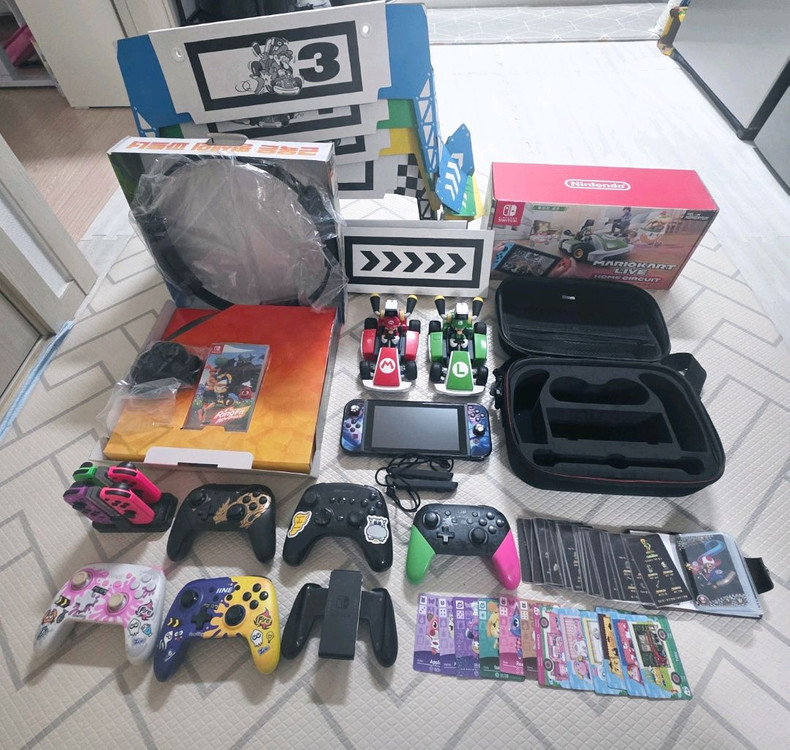 닌텐도 스위치 풀세트 판매합니다. 자꾸교환하자고하시는데 닌텐도2. 또는 메타퀘스트3 125. 메타퀘스트 512랑 교환하겠습니다. 추가금제시및오고갈수있습니다. 마리오카트 라이브 홈 서킷 2개 포함입니다. 다양한 컨트롤러와 아미보, 케이스, 게임팩도 함께 드립니다 - 닌텐도 스위치 본체 - 조이콘 여러개 - 프로 컨트롤러 - 마리오카트 라이브 홈 서킷 -링 피트 - 아미보 다수 - 스위치 케이스 - 게임팩 -게임50개 이상 전반적으로 사용감 있습니다 게임. 사진 따로보내드려요 닌텐도