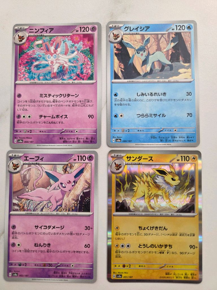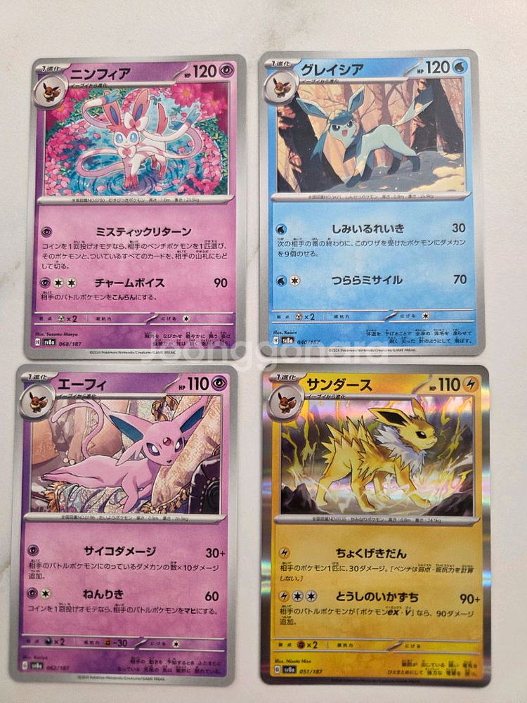 포켓몬 카드 님피아, 글레이시아, 에브이, 쥬피썬더 카드입니다 사진에서 보이는 그대로의 상태이며, 소장용으로도 좋습니다 다양한 포켓몬 카드를 모으는 재미를 느껴보세요 포켓몬 카드 컬렉션을 완성하고 싶은 분들께 추천드려요
