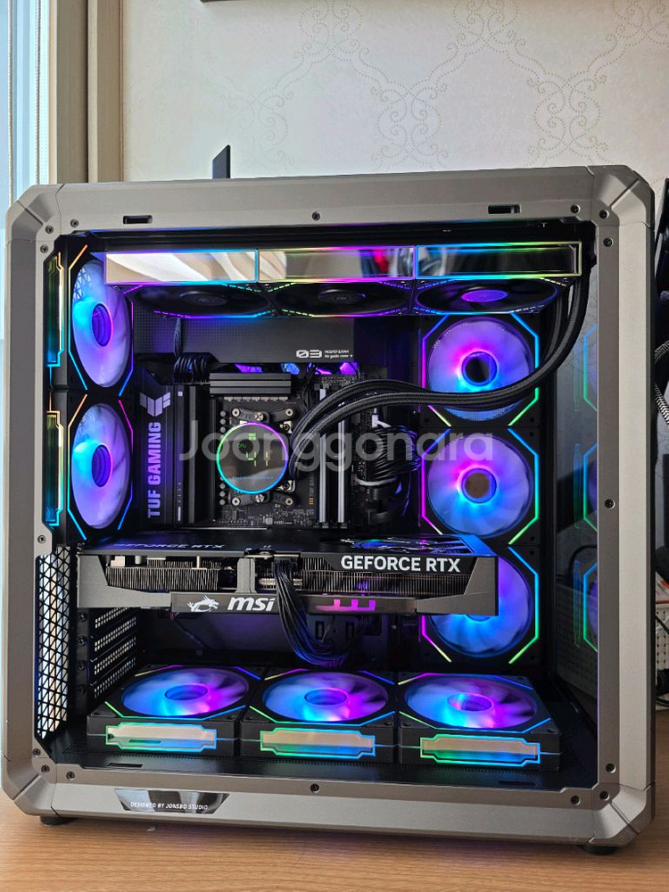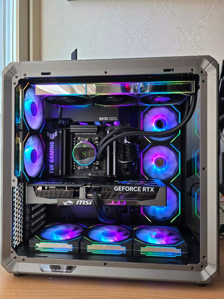 AMD 라이젠 9950x3d, rtx5070ti 등 컴퓨터 본체 판매 cpu : amd 라이젠 9950x3d(16코어 32스레드), 작업 및 게이밍 최강 cpu쿨러 : 써멀라이트 프로즌매직 v2 360mm 수랭 메인보드 : 아수스 tuf b850m wifi7(블루투스 및 무선인터넷 가능, 최신 바이오스) ssd : 마이크론 p310 1테라 nvme m.2 pcie4.0 램 : DDR5 32기가 (16기가 2개, 마이크론램 모듈) 그래픽카드 : msi rtx5070ti trio 16g 파워 : 시소닉 포커스 v4 골드 등급 850w atx3.1 케이스 : 존스보 x400 pro(argb 팬 10개 추가 설치, 측면과 하단 리버스팬 6개, 후면 정방향 2개, 메인보드 뒷면 정방향 2개) 윈도우 : 윈도우11프로(정품 인증) 크기의 컴퓨터로 디자인도 깔끔하고 팬 10개 설치, 수랭쿨러 등 성능 및 쿨링 성능 좋습니다. 어제 조립해서 윈도우, 기본프로그램 세팅 했습니다. 같은 구성으로 다나와에서 견적 뽑으면 공임이랑 세팅비용 빼도 400만원 중반 가격 윈도우 설치 후 3d마크테스트 등 정상작동 확인 정도만 하고 케이스 옆 유리 비닐제거 안한 새컴퓨터입니다. 선정리, 윈도우11프로, MS오피스, 한글 등 프로그램 세팅 최적화해서 바로 사용 할수 있게 해놨습니다. 모니터랑 키보드, 마우스만 연결하면 바로 사용 가능입니다. 수원, 용인에서 직거래 위주로 가능합니다.