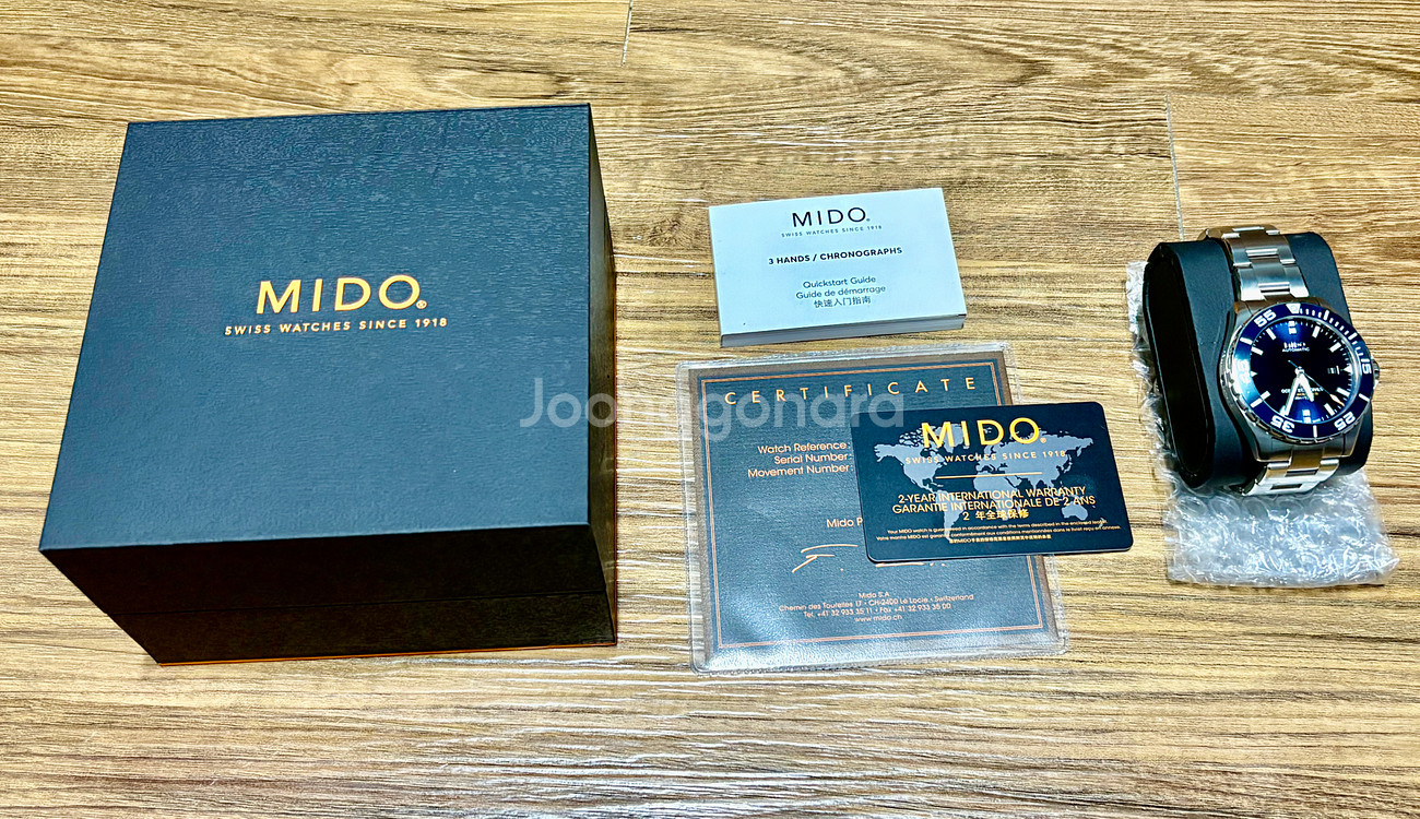 미도 오션스타 600 블루 색상 새상품 판매 박스랑 보증서, 설명서까지 풀 구성 2년 국제 보증 가능, 국내 정품 서울 명동/홍대,인천 직거래 가능 190만원에서 내린 마지막 가격 5월 10일까지만 판매 예정 MIDO OCEAN STAR 600