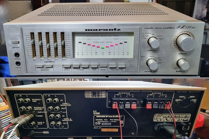 MARANTZ(마란츠) PM-550DC 인티앰프입니다. 1980년대에 출시된 빈티지 인티앰프로, DC 설계 방식을 채택하여 높은 음질을 제공하며 Marantz 특유의 따뜻하고 자연스러운 사운드가 돋보이며, 내장 포노 스테이지를 포함하고 있어 턴테이블과의 매칭에도 우수한 성능을 발휘합니다. DC 설계 방식을 채택하여 신호 경로에서 커패시터를 제거함으로써 보다 순수한 사운드를 구현하며 EQ와 베이스, 트레블 조정 및 라우드니스 기능을 탑재해 사용자의 취향에 맞게 음색을 조절할 수 있습니다. 입력단은 포노1(MM), 포노2(MM/MC), 튜너, AUX, 테이프 1/2 등이 있으며 스피커 A/B 2조 가능하며 약간의 생활감 외 상태도 전반적 좋은 편이고 저렴하게 마란츠 음색 즐기기 좋습니다. 30만원이며 OIO 963O 968O 가급적 문자로 연락 주시기 바랍니다. 스펙 전원 출력 : 채널 당 65W, 8Ω (스테레오) 주파수 응답 : 10Hz ~ 50kHz 총 고조파 왜곡 : 0.03 % 댐핑 계수 : 80 입력 감도 : 0.28mV (MC), 2.8mV (MM), 150mV (라인) 신호 대 잡음비 : 82dB (MM), 95dB (라인) 출력 : 410mV (라인) 스피커 부하 임피던스 : 4Ω (최소) 반도체 : 트랜지스터 47 개, 다이오드 45 개, IC 8 개 크기 : W 416 x H 117.5 x D 329mm 무게 : 8kg